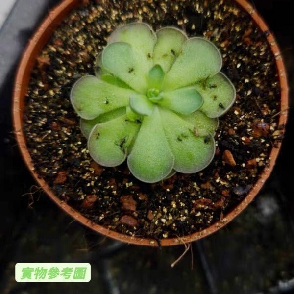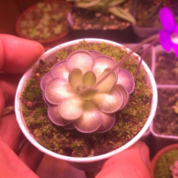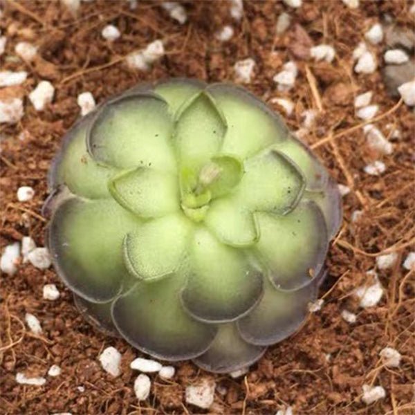 The plants form small rosettes of leaves. During the summer months, the plant produces leaves that are covered in glandular hairs on their upper surface. These leaves are capable of catching, killing, and digesting small insect prey for the plant. The edges of the leaves may be tinged a bluish-purple, and in bright light, the entire leaf may be this color. During the winter months, the plant loses its carnivorous leaves and produces a rosette of reduced succulent leaves instead. Deep purple flowers are produced singly at the end of short scapes.