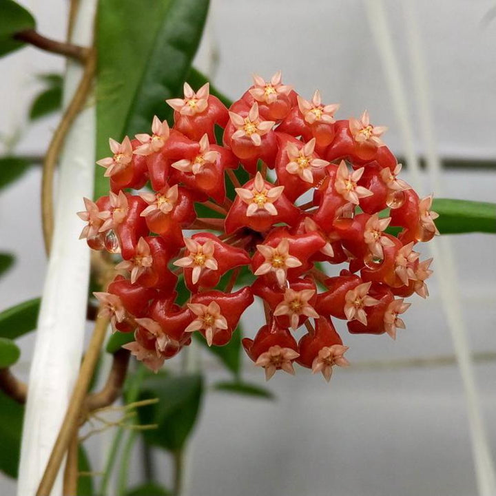 Hoya ilagiorum is a vining epiphytic plant in the family Apocynaceae.It is native to the Philippines. The inflorescence is made up of multiple flowers in a group of umbel. The inflorences are red orange, star-shpaed with yellow centers. They are heavily scented with a sweet fragrance.Flower appears in waxy red orange colored which is very shiny once the sun light on very brightly. Leaves are thick large oval with waxy looking .