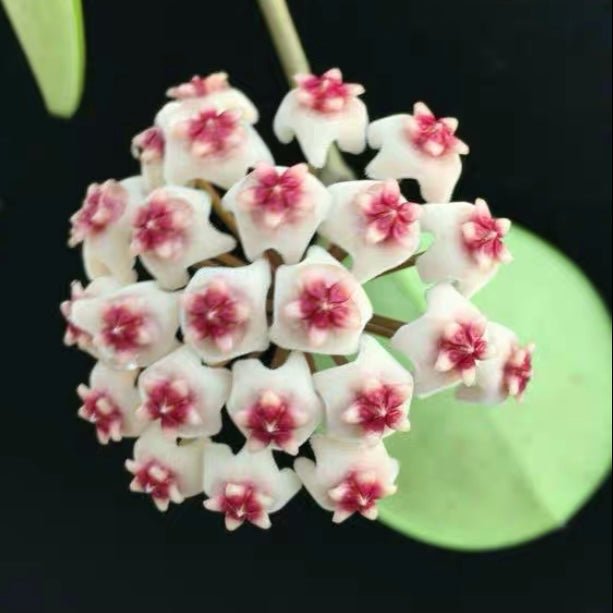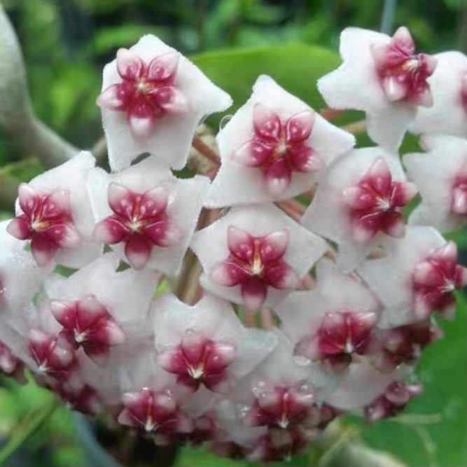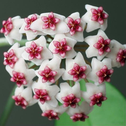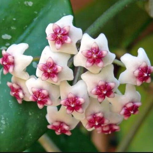 Hoya obovata is a viningepiphytic plant in the dogbane family Apocynaceae. It is orignated from south-east Asia.The inflorescence is made up of multiple flowers in a group of umbel. The inflorences are creamy,star-shpaed with purple centers. They like made up of wax.The flower's surface fuzzy beacuse it is covered by tiny hair. They are heavily scented with a sweet fragrance. They are heavily scented and may produce excess nectar that drips from the flowers.