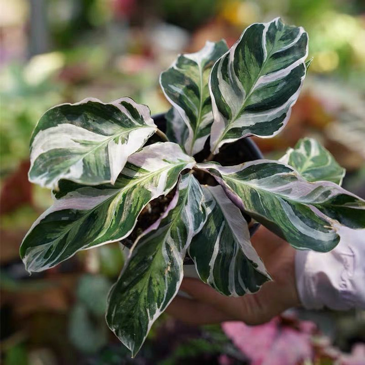 The Calathea 'White Fusion' cultivar top side of its leaves features contrasting white markings alongside the green, and the underside has a pretty light purple-pinkish hue that also runs down the stems.