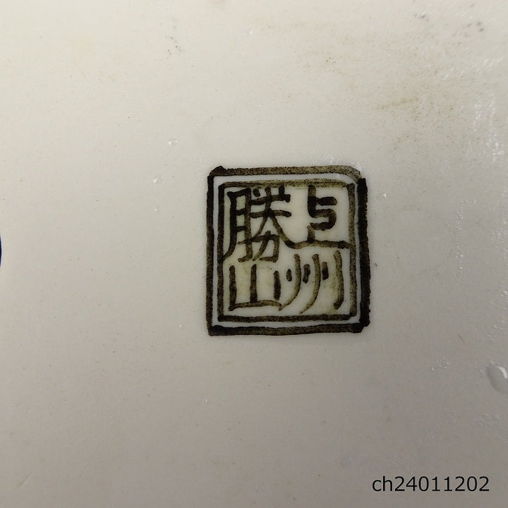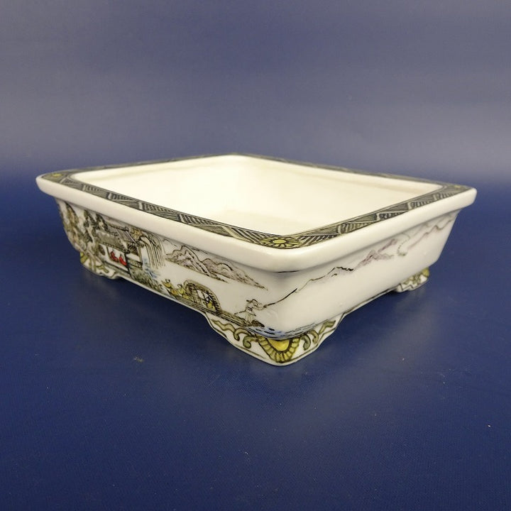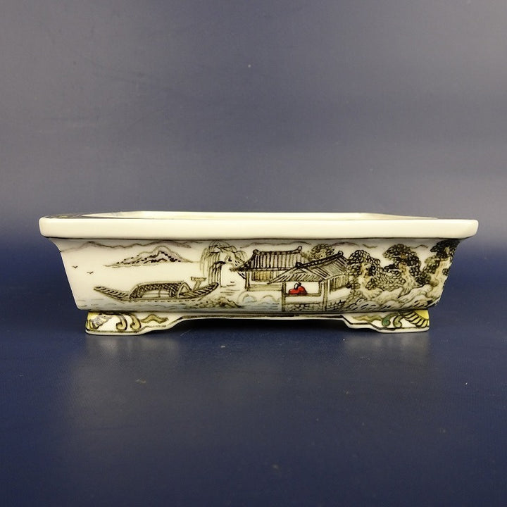 中古盆栽鉢 上州 勝山 小型 長辺 約12cm 長方鉢 外縁 色絵 人物 舟 風景 山水図 箱付 観賞用 中古鉢 h1198421491