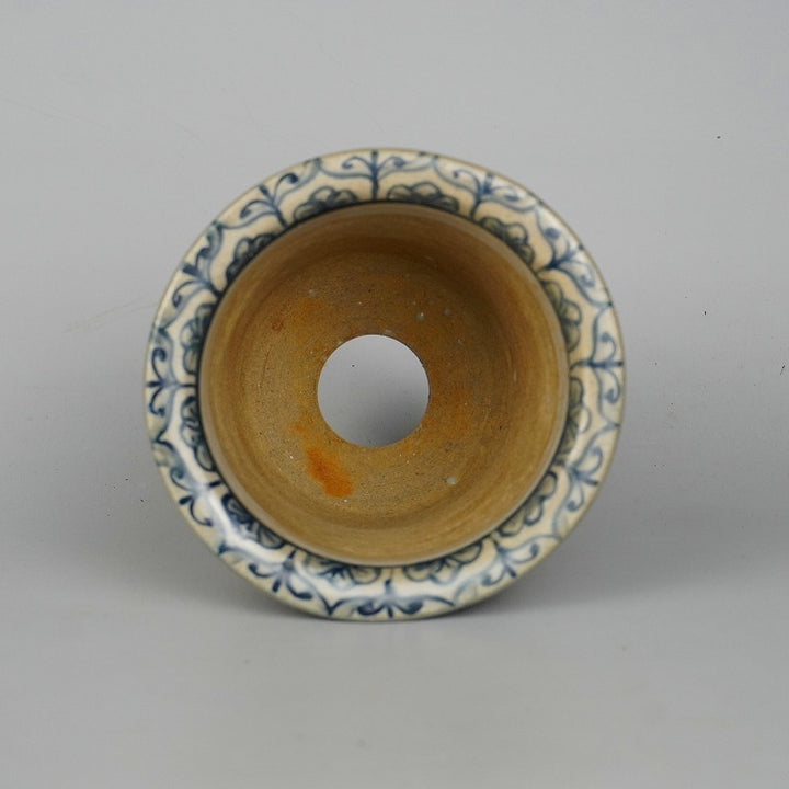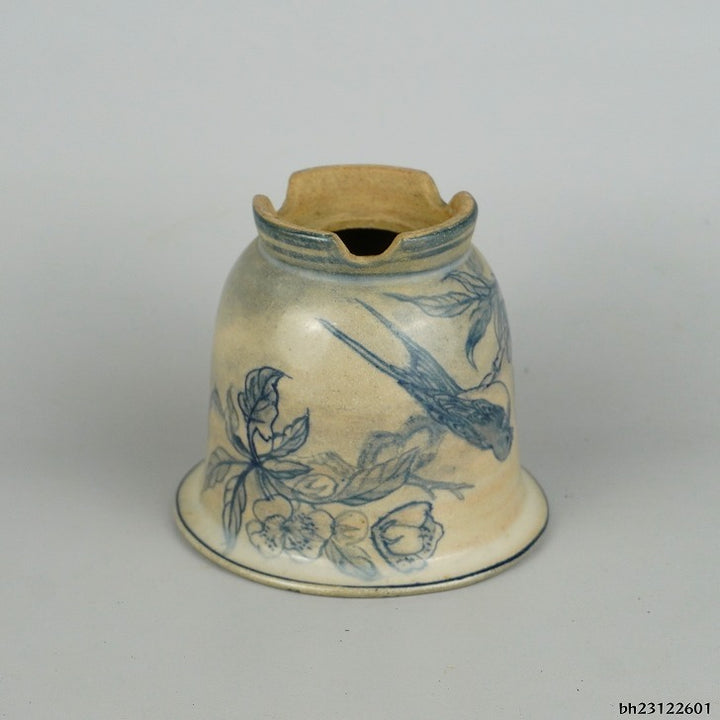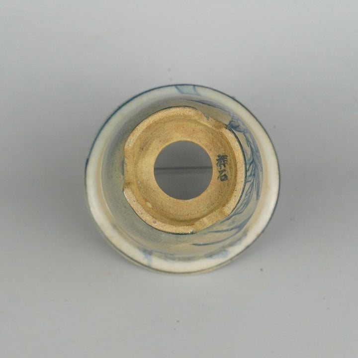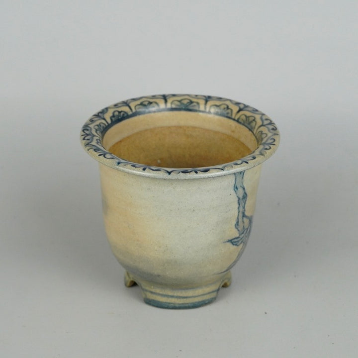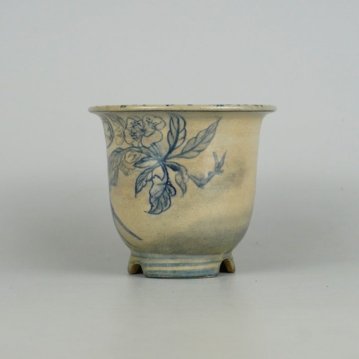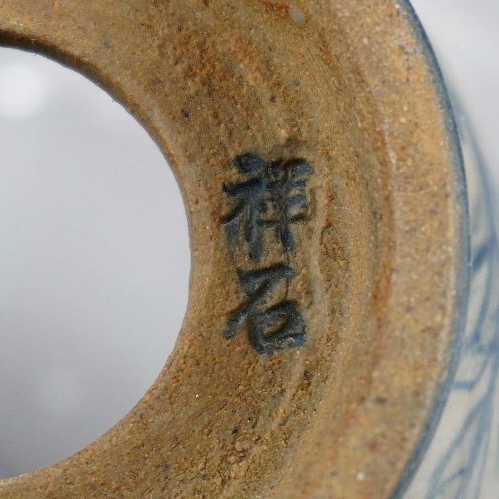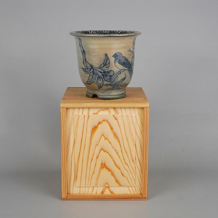 中古盆栽鉢 初代 祥石 小型 長辺 約 10.8cm 丸鉢 染付 鳥 花 箱付 観賞用 中古鉢 t1198412960