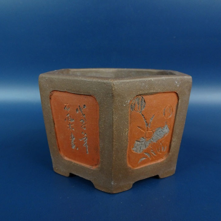 【中古】盆栽鉢 柏陽造記 長辺 約 10.5cm 六角鉢 窓入 釘彫 泥鉢 中国鉢 現品 中古鉢 品名柏陽造記 サイズ高さ 約6.7センチ...