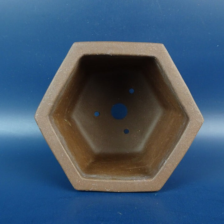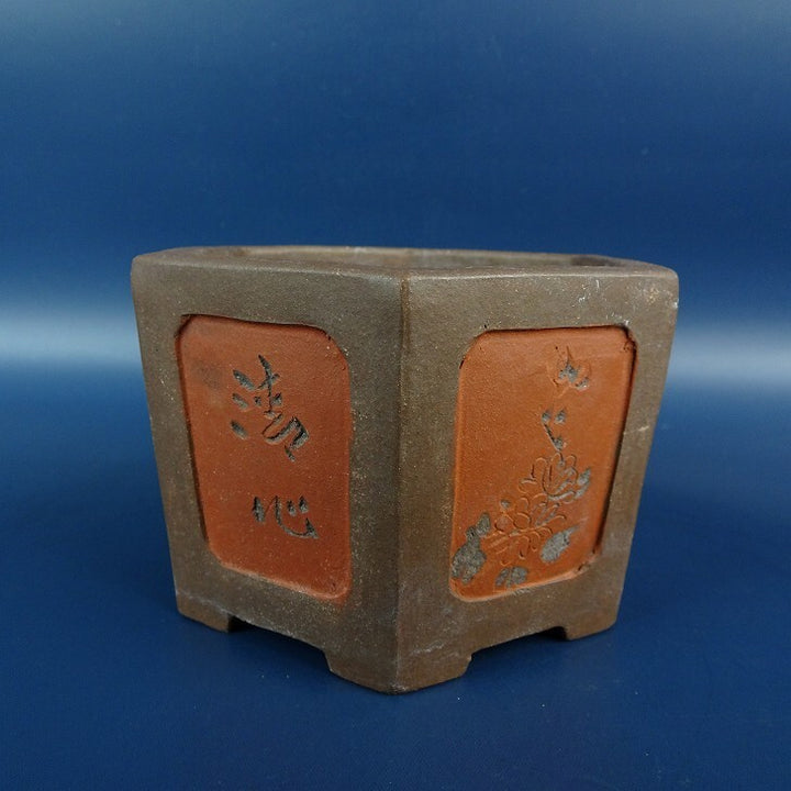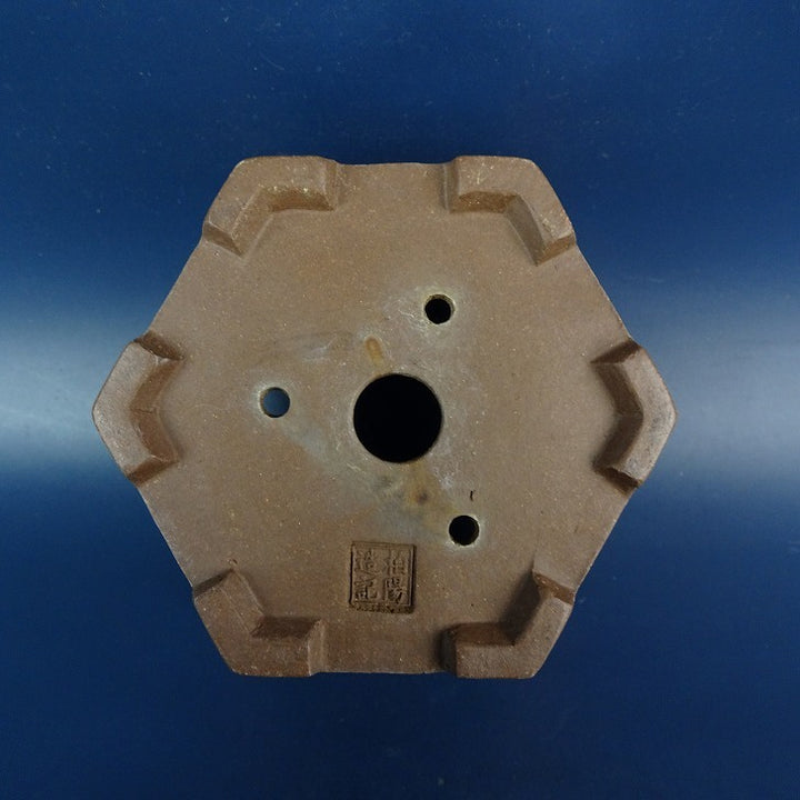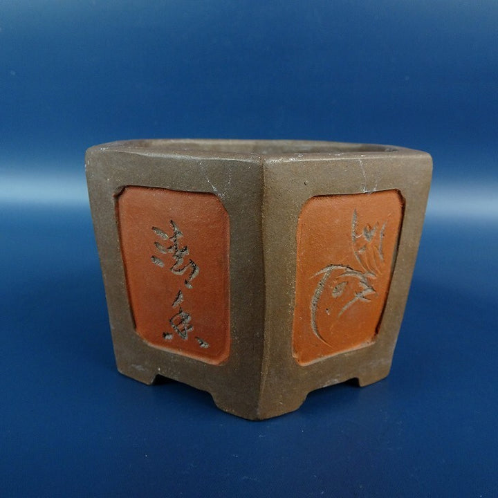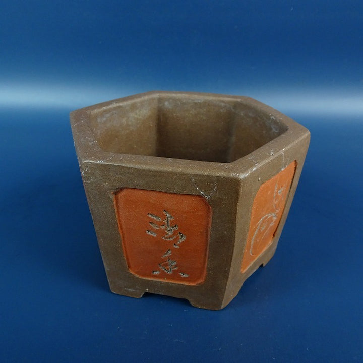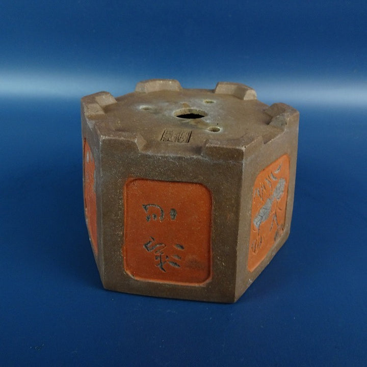 中古盆栽鉢 柏陽造記 長辺 約 10.5cm 六角鉢 窓入 釘彫 泥鉢 中国鉢 中古鉢 g1198421114