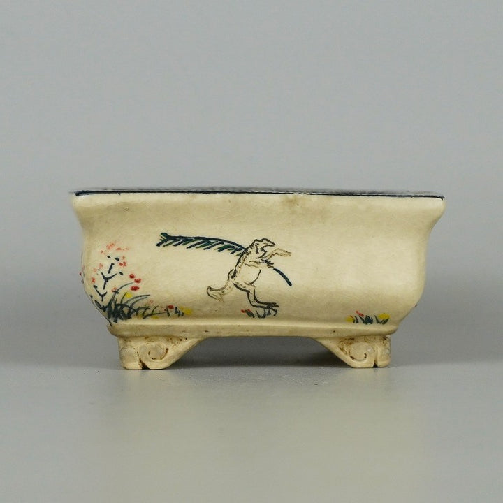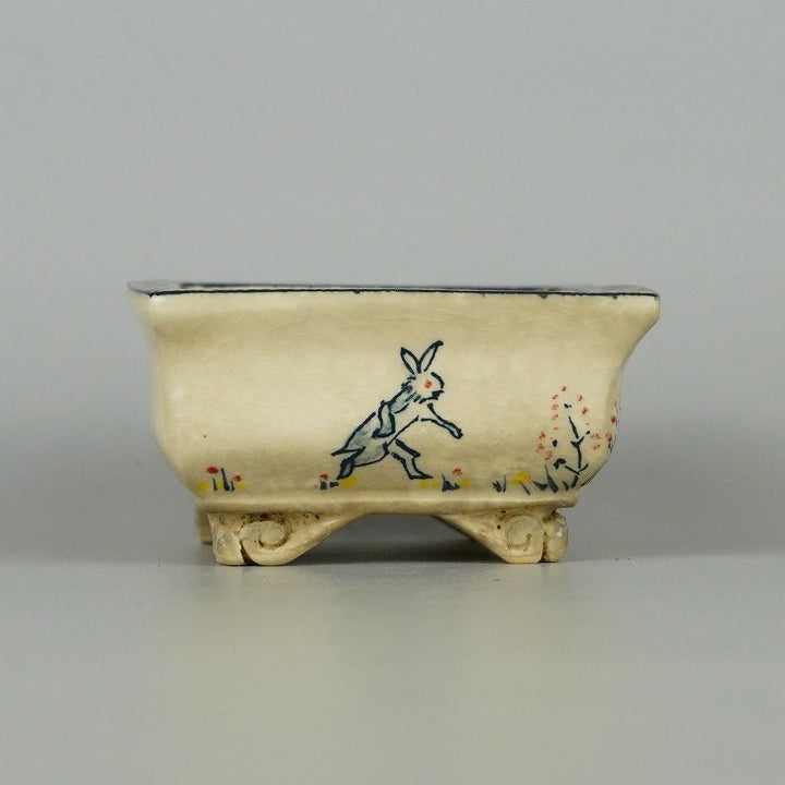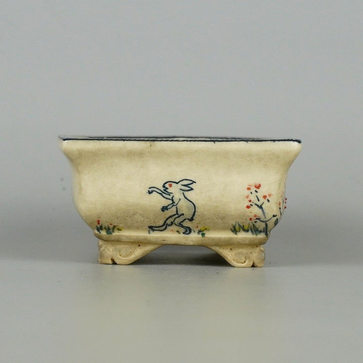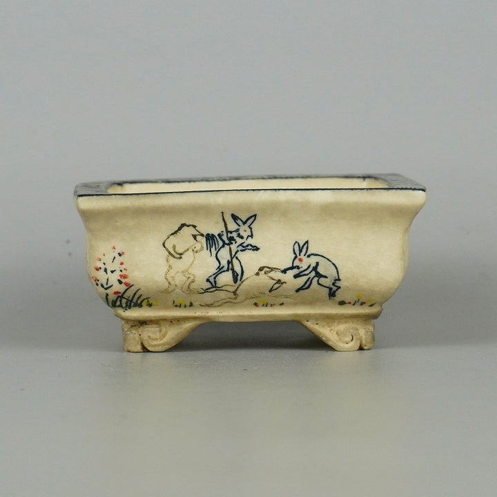盆栽鉢 無門 小型 長辺 約8.5cm 長方鉢 染付 鳥獣戯図 ウサギ カエル 観賞用 現品 中古鉢 品名無門...