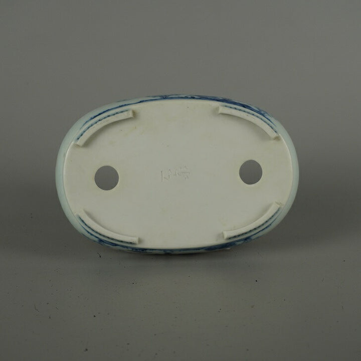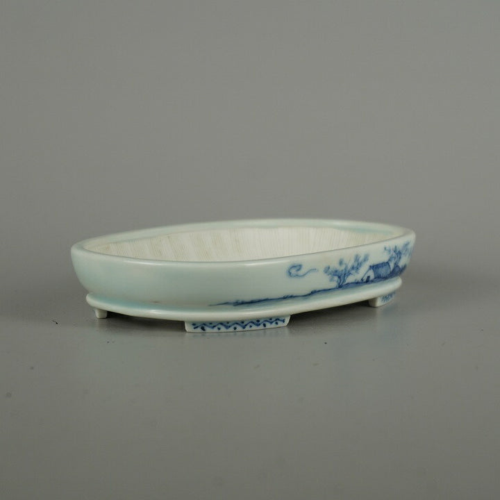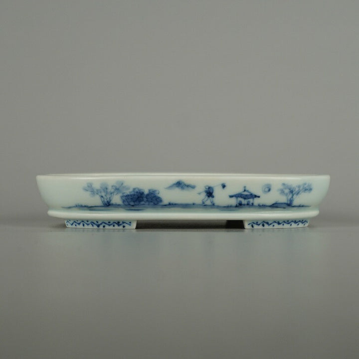 中古盆栽鉢 石泉 小型 長辺 約 14.5cm 楕円鉢 下帯 染付 山水図 人物 模様 鑑賞 観賞用 中古鉢 e1206092278