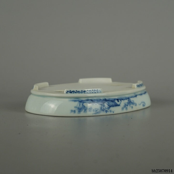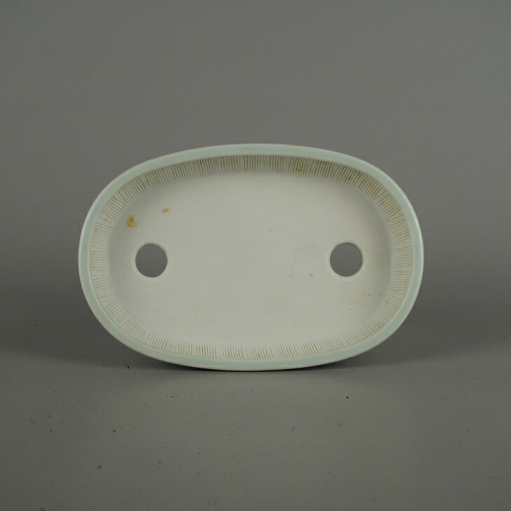 盆栽鉢 石泉 小型 長辺 約 14.5cm 楕円鉢 下帯 染付 山水図 人物 鑑賞 観賞用 現品 中古鉢 品名石泉...