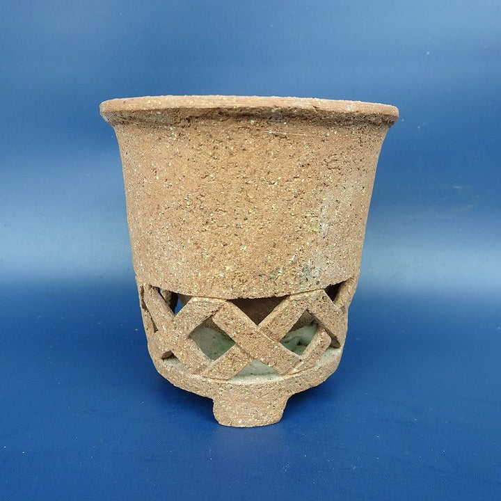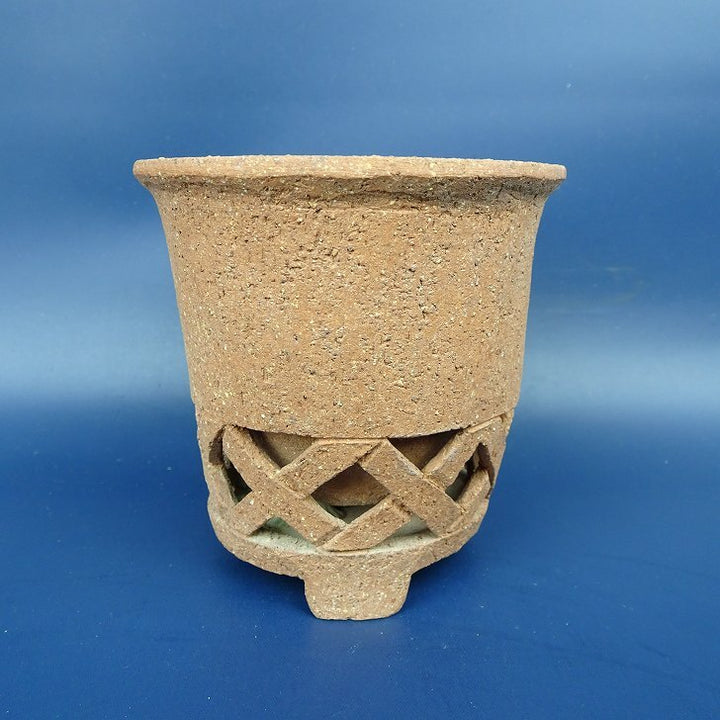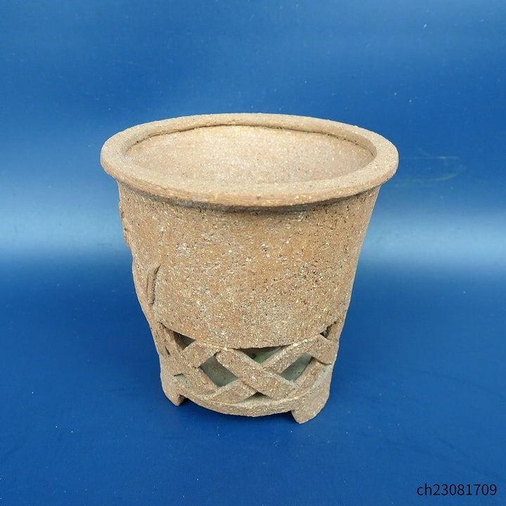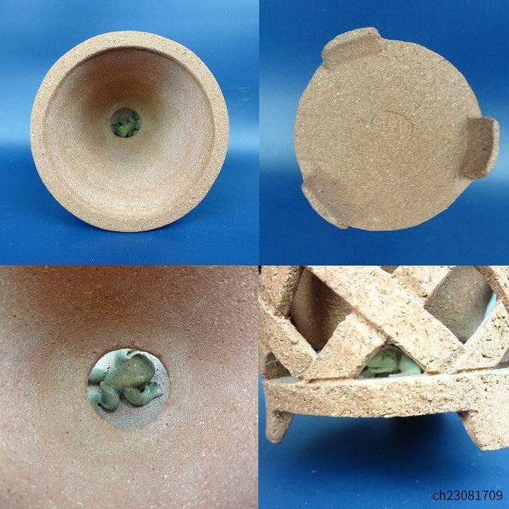 中古盆栽鉢 神戸 小鉢 長辺 約9cm 丸鉢 透かし 格子 浮彫 花 蛙 泥鉢 中古鉢 j1198411639