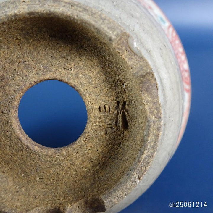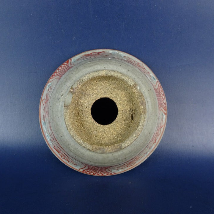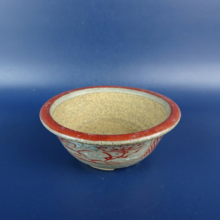 中古盆栽鉢 竹峯 小鉢 長辺 約 8.8cm 丸鉢 外縁 赤絵 花 模様 観賞用 中古鉢 n1198412614