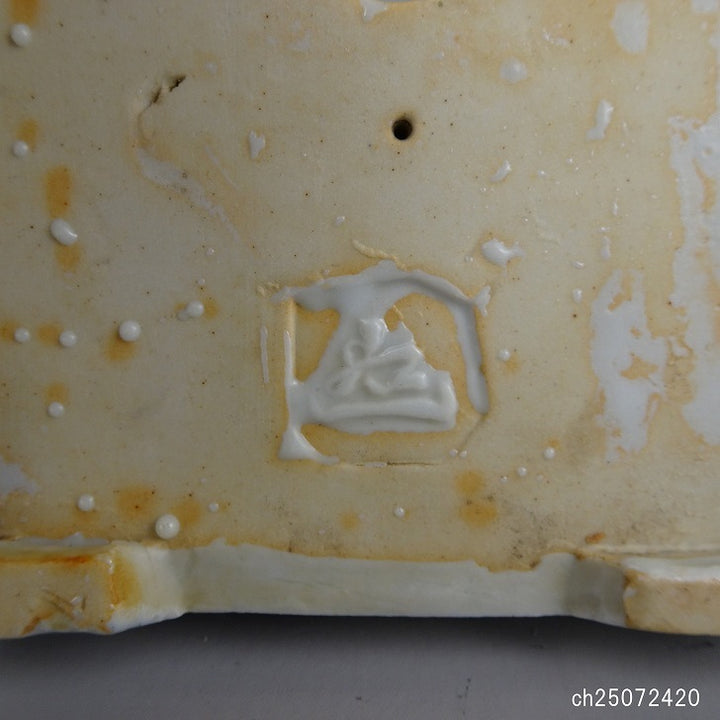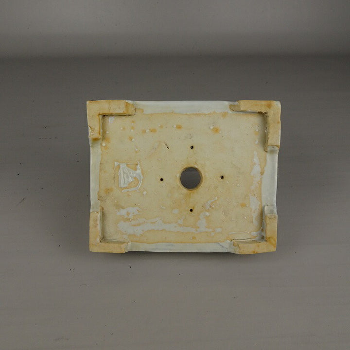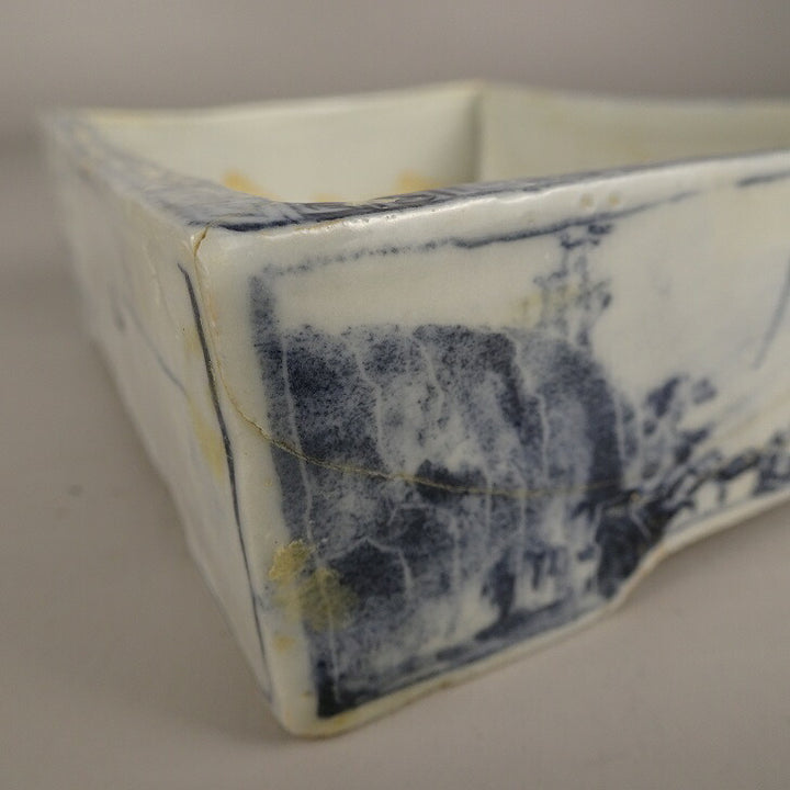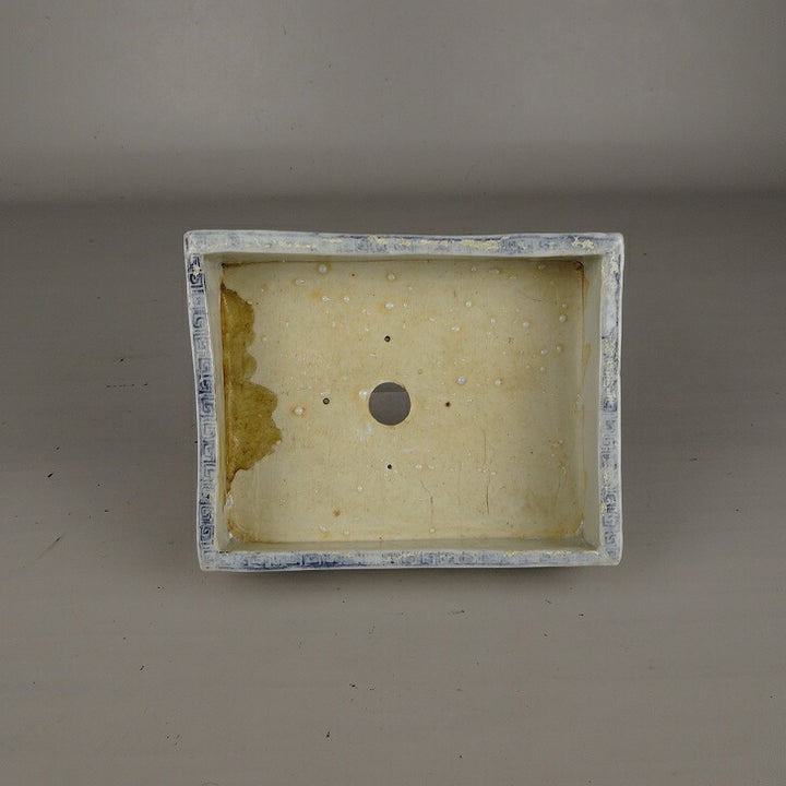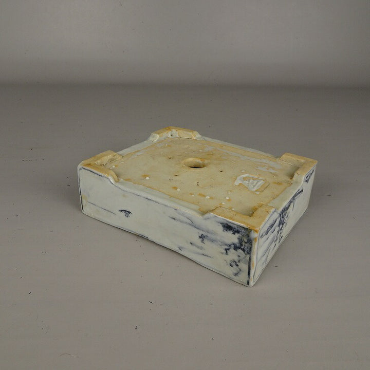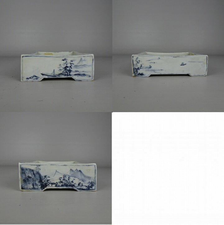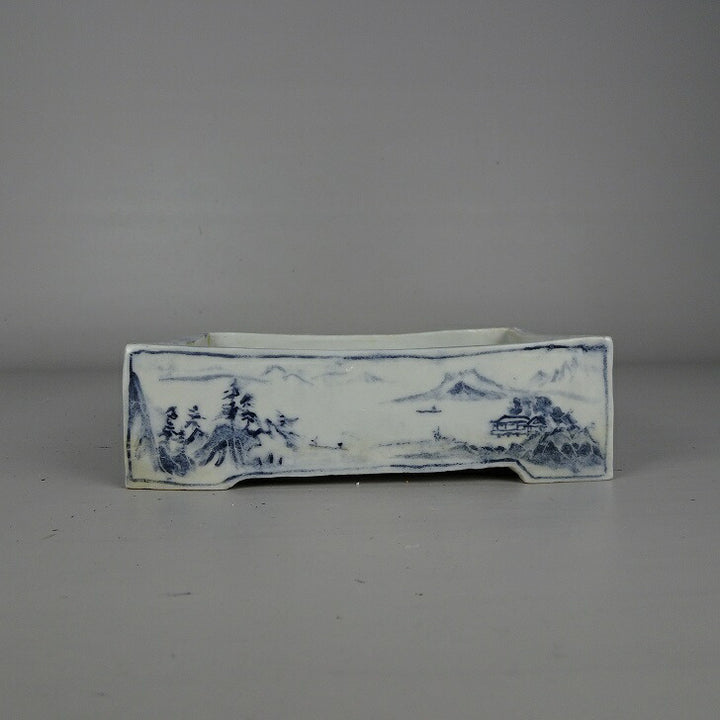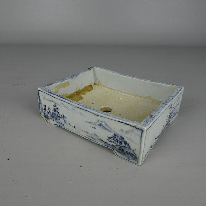 【中古】 盆栽鉢 落款あり 小型 長辺 約 13.7cm 長方鉢 染付 山水図 現品 中古鉢 品名落款あり...