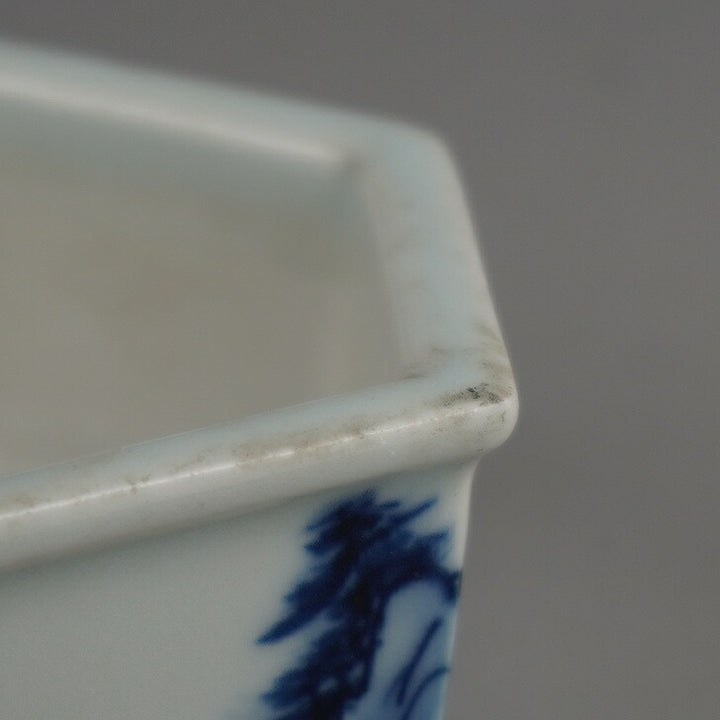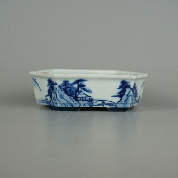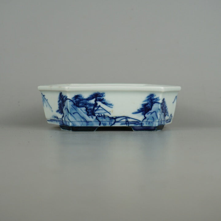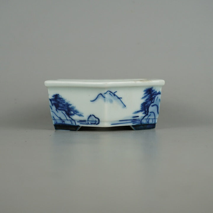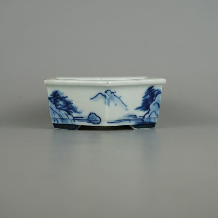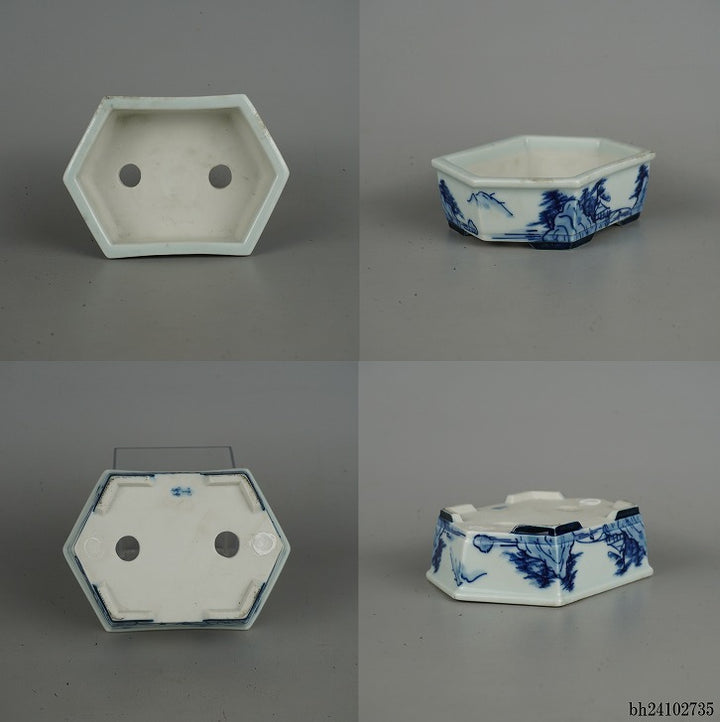 盆栽鉢 落款あり 小型 長辺 約 14.2cm 六角鉢 染付 山水図 観賞用 現品 中古鉢 品名落款あり...