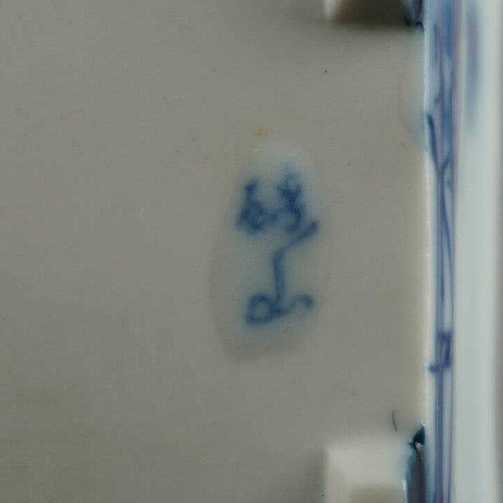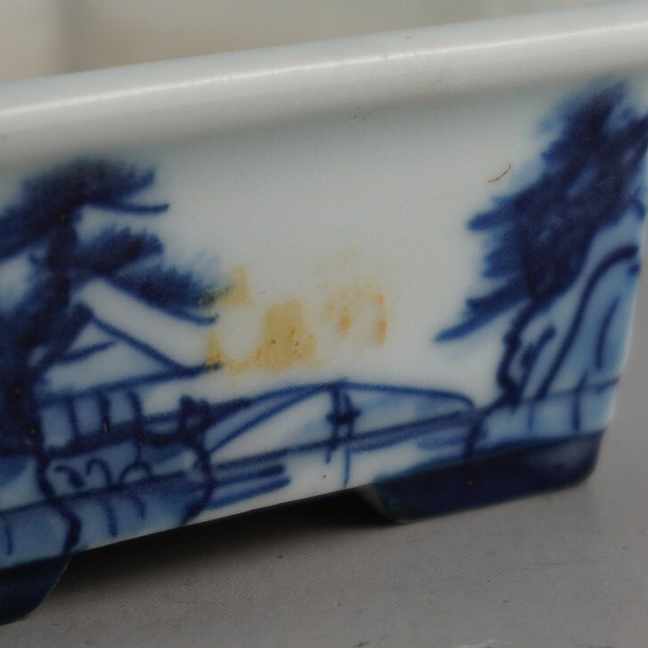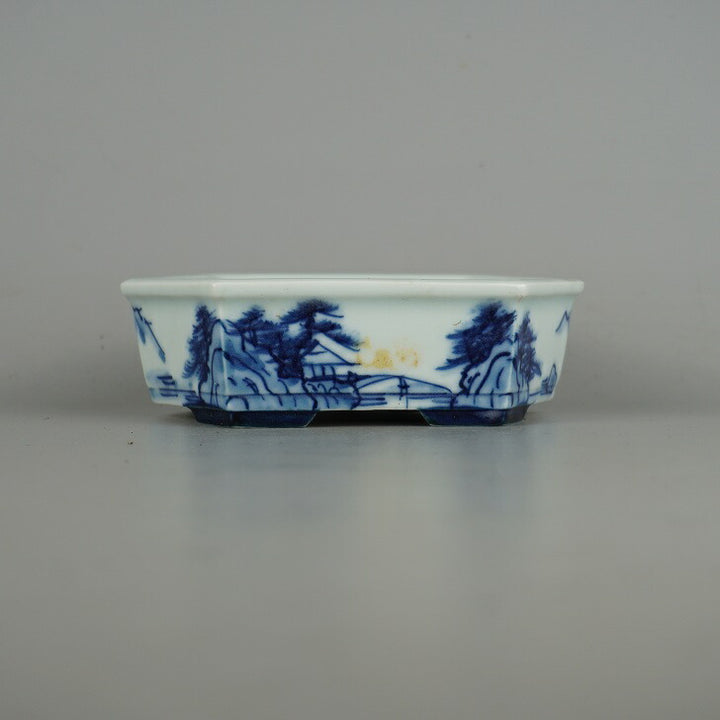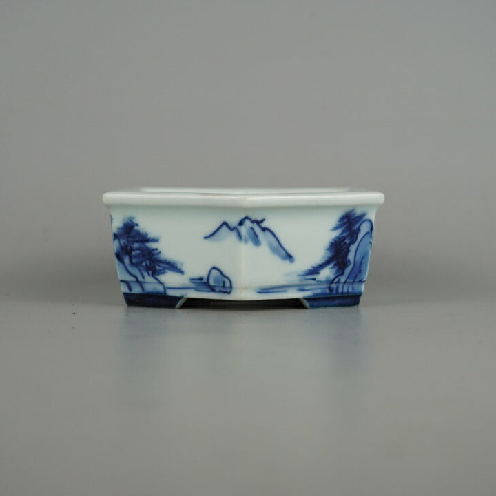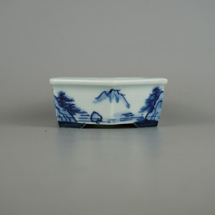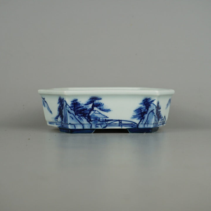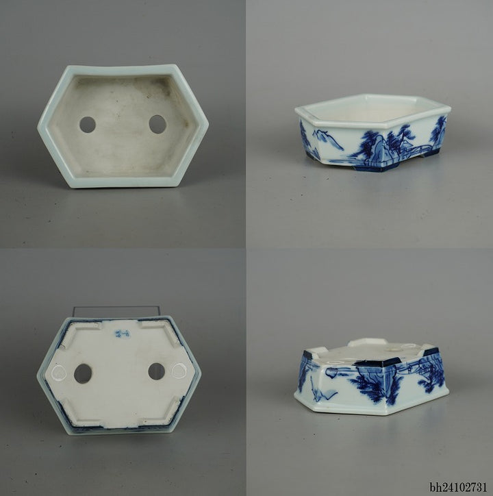 盆栽鉢 落款あり 小型 長辺 約14.3cm 六角鉢 染付 山水図 観賞用 現品 中古鉢 品名落款あり...