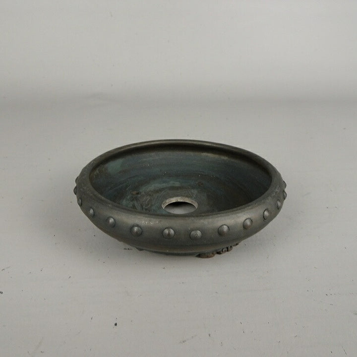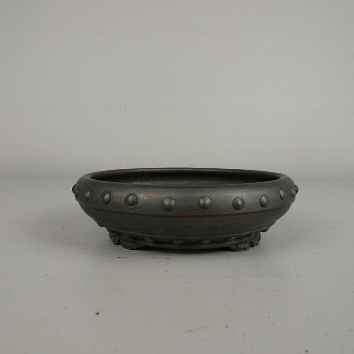 中古盆栽鉢 落款なし 小型 長辺 約 11.5cm 丸鉢 鋲打 雲足 中国鉢 中古鉢 p1209397132