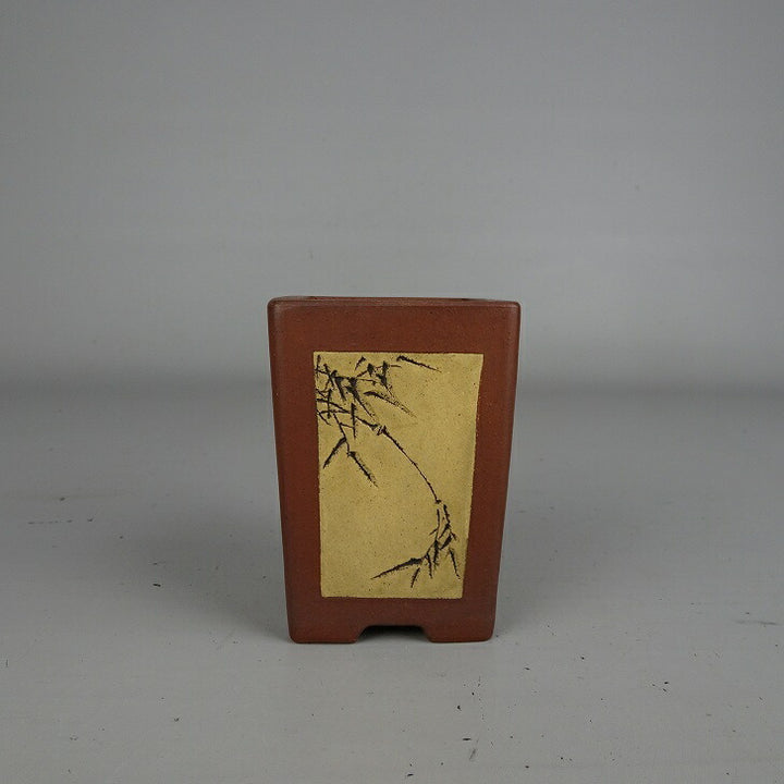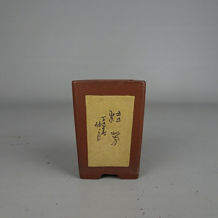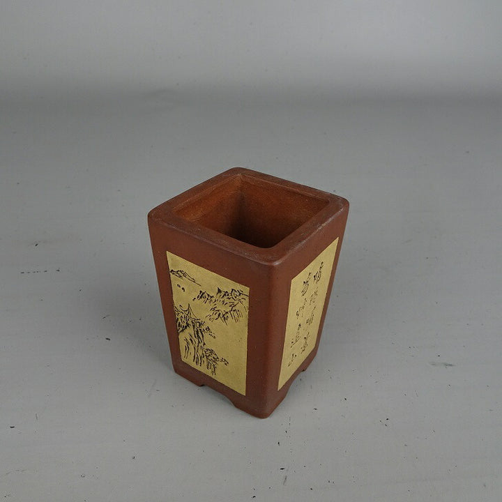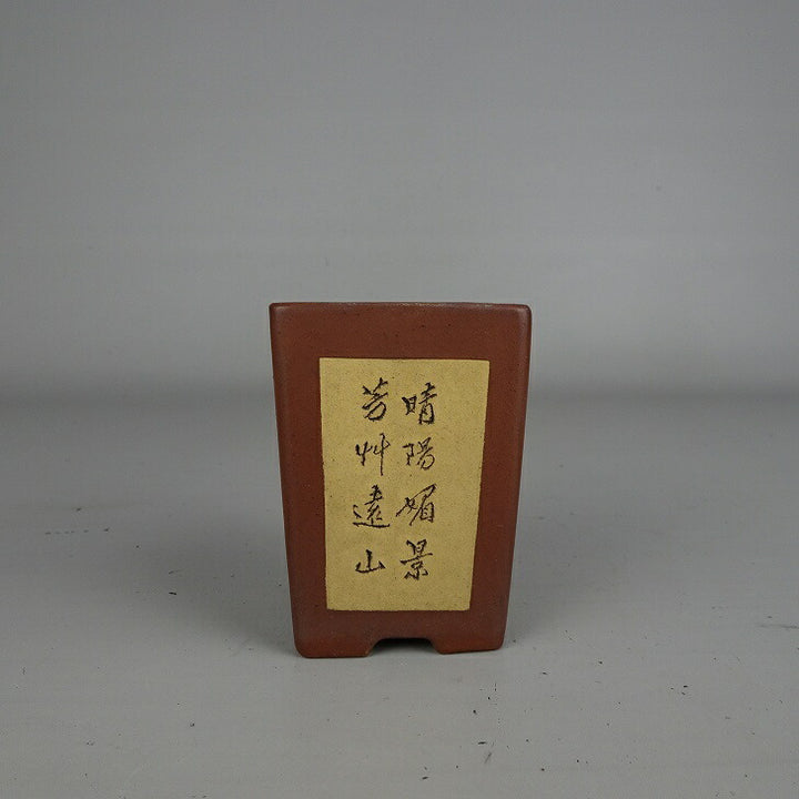 【中古】盆栽鉢 落款なし 小鉢 高さ 約 7.7cm 正方鉢 釘彫 風景 文字 泥鉢 中国鉢 現品 中古鉢 品名落款なし サイズ高さ 約 7.7センチ...