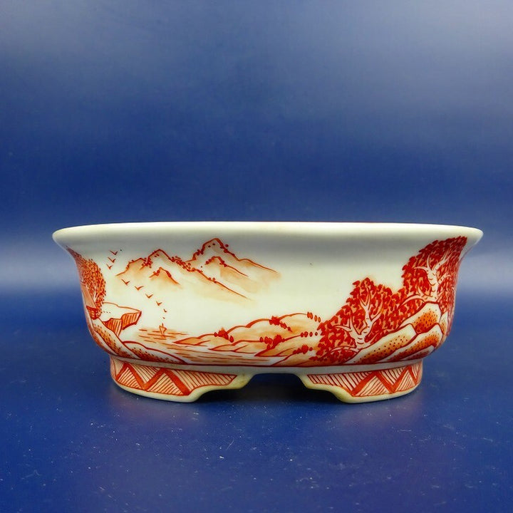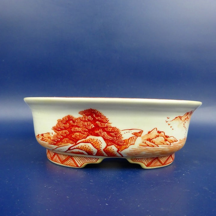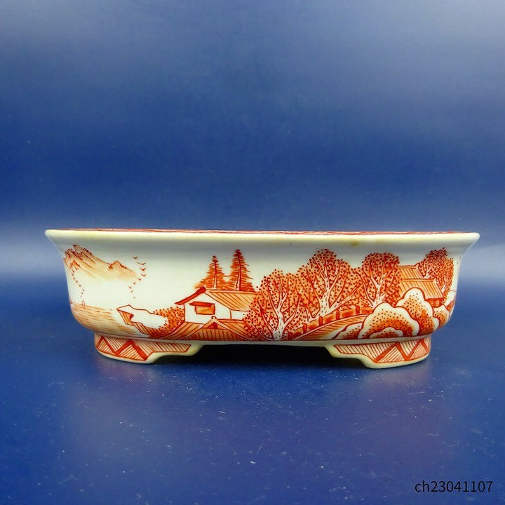 【中古】盆栽鉢 月香 小型 長辺 約16cm 長方鉢 赤絵 山水図 外縁 撫角 段足 現品 中古鉢 送料無料 商 品 名月香 サ イ ズ高さ 約4.3センチ...