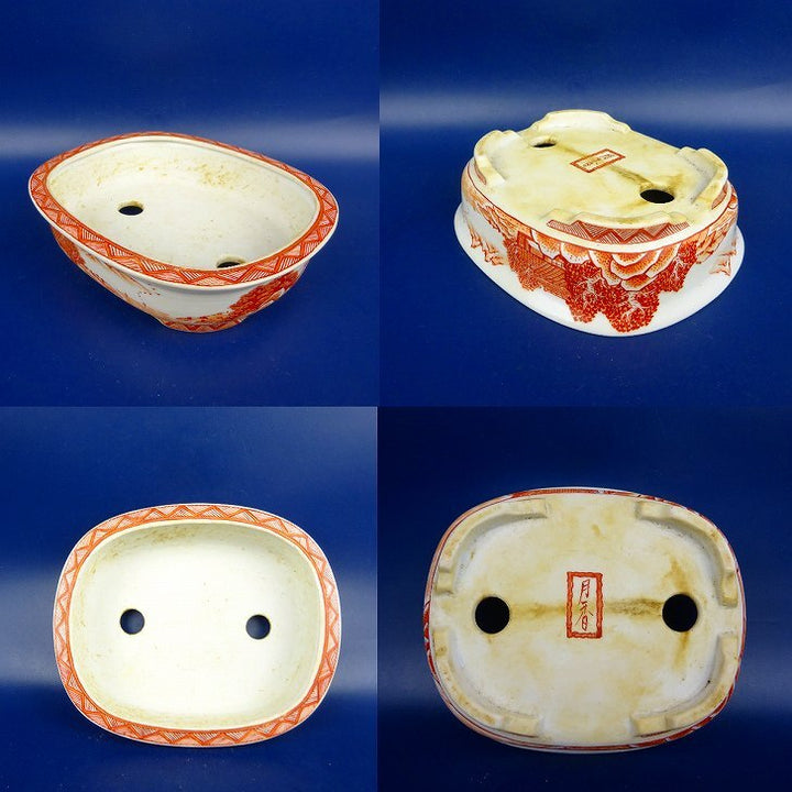 中古 盆栽鉢 月香 小型 長辺 約16cm 長方鉢 赤絵 山水図 外縁 撫角 段足 中古鉢 t1198412962