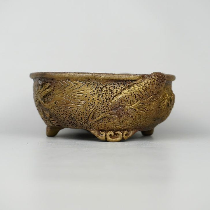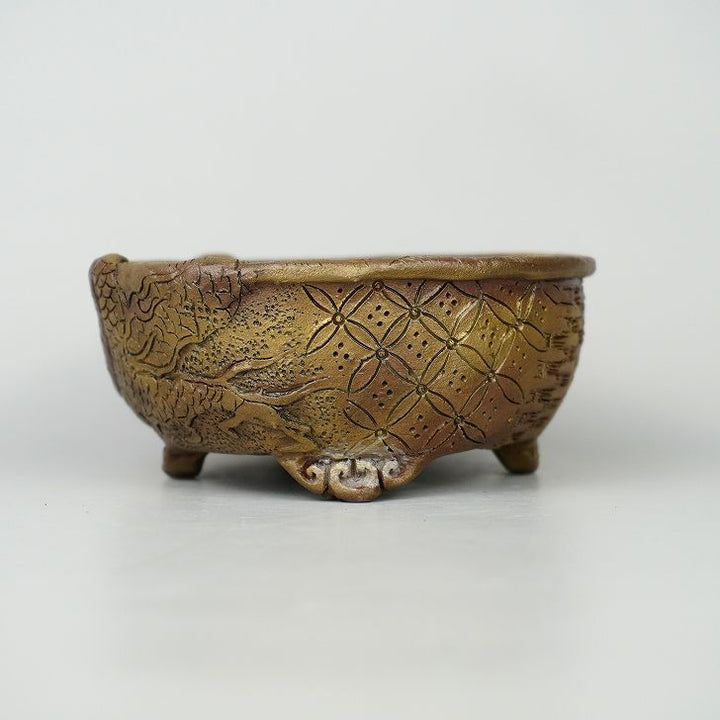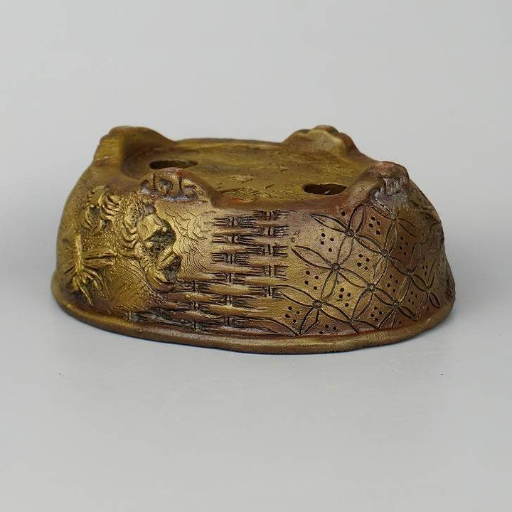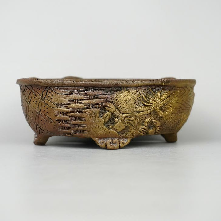 嵐山 谷嵐山 浮彫 龍 蟹 トンボ図 楕円鉢 籠目 観賞用 盆栽鉢 新品 b1198425103