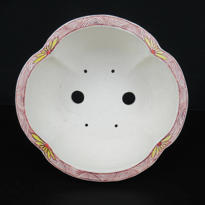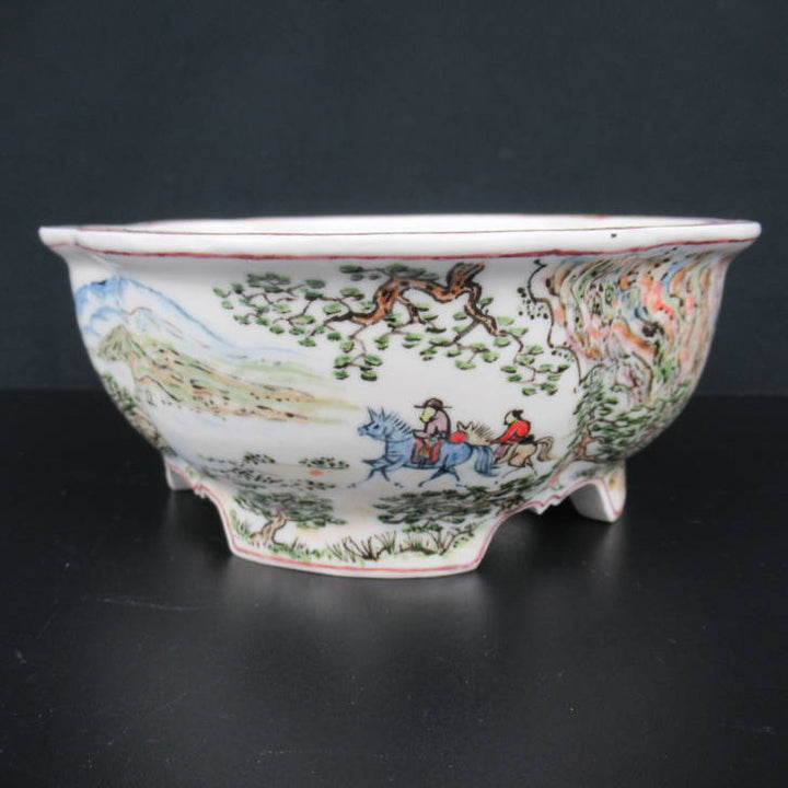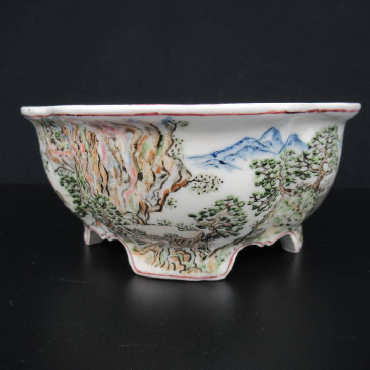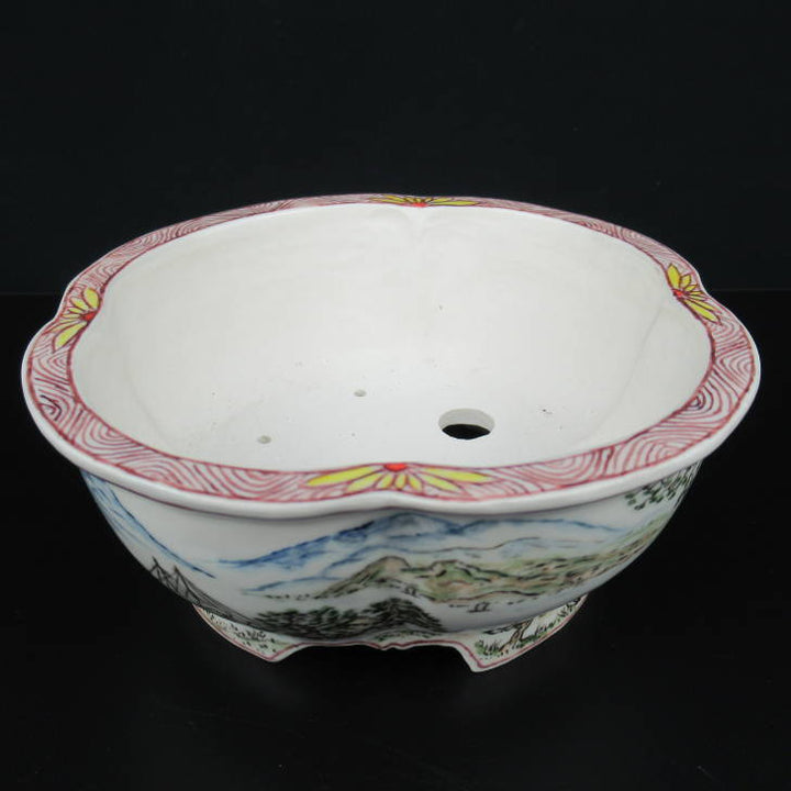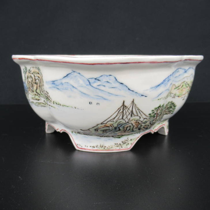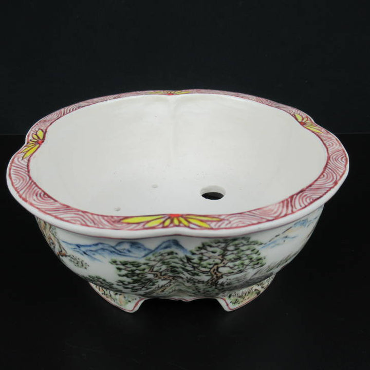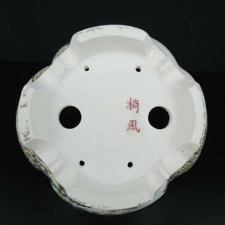 梢風 盆栽鉢 木瓜 色絵 山水人物図 新品