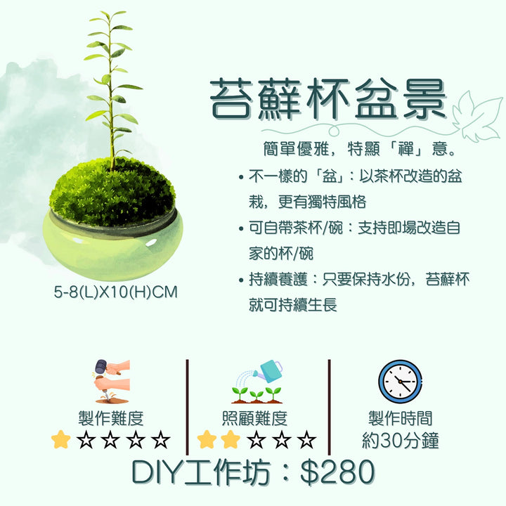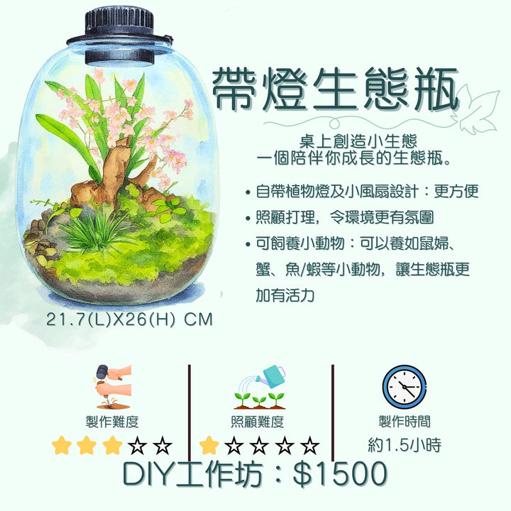 DIY 生態瓶工作坊,專為追求放鬆、享受親子時光及情侶互動的你而設。在這裡,你將療癒板,親手將苔蘚刻、植物和裝飾,一步組成一個充滿生命力的微縮森林,感受從無到有的滿足感,進而完成聯絡的平靜,以及親手創造的無限歡樂。