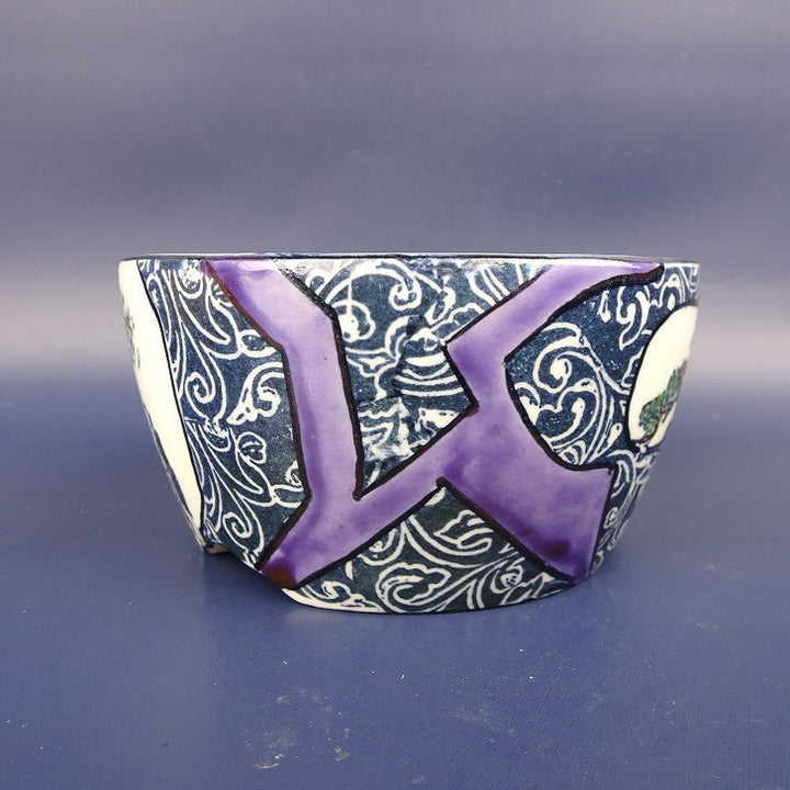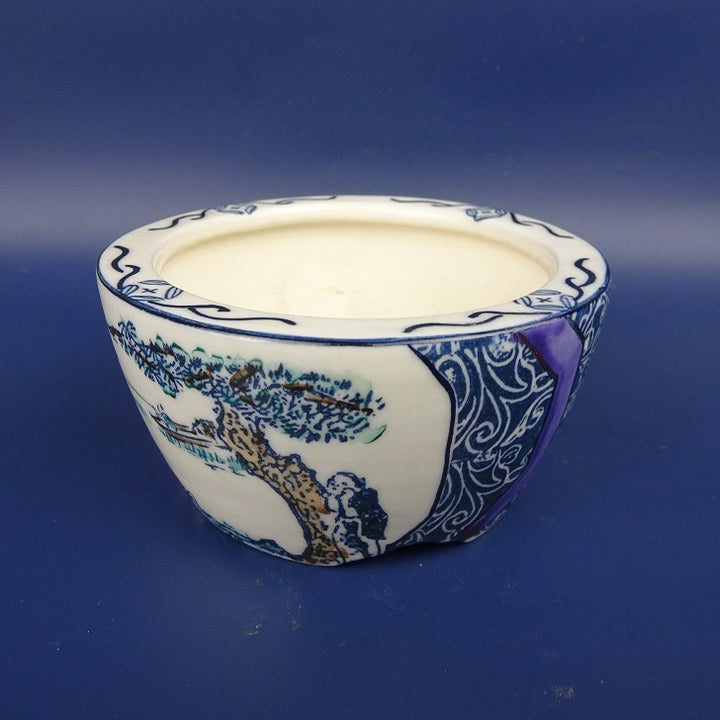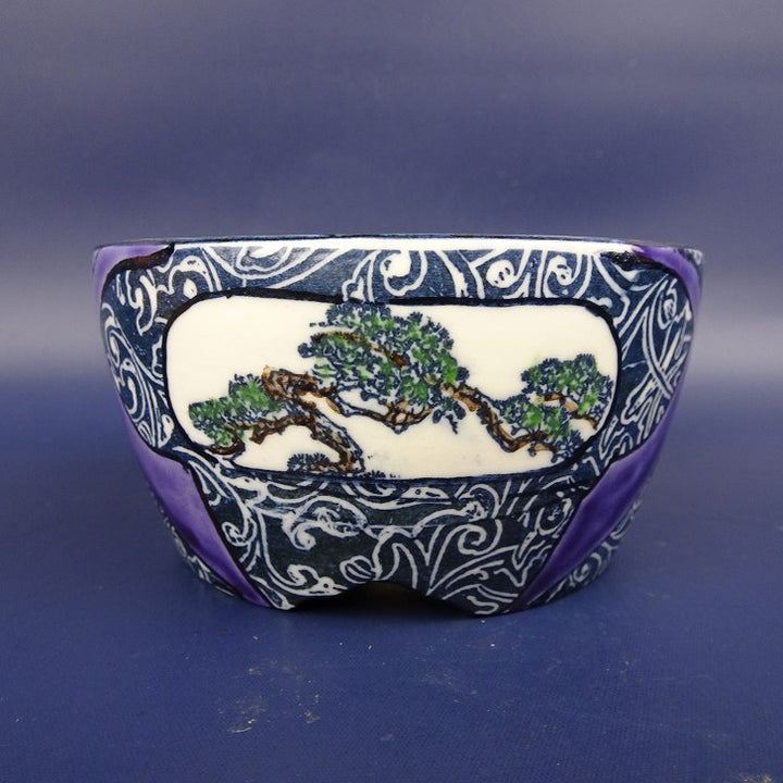 盆栽鉢 御蔵山 小型 長辺 約9.8cm 丸鉢 色絵 風景 窓抜 松 人物 カニ 舟 箱付 新品 r1198403535