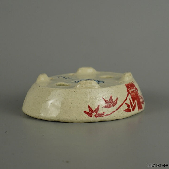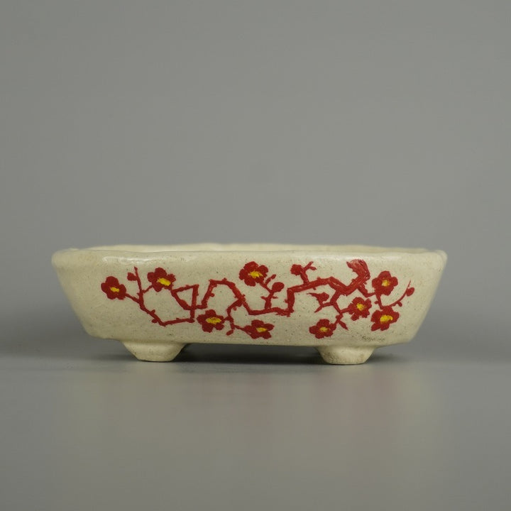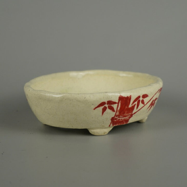 盆栽鉢 越前文山 小型 長辺 約 12.7cm 楕円鉢 赤絵 竹 笹 花 はな ハナ 鑑賞 観賞用 新品 t1206092755