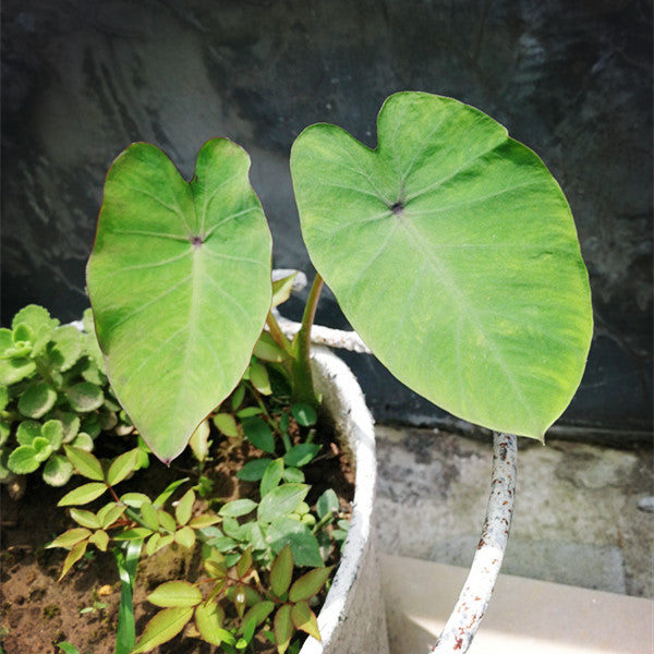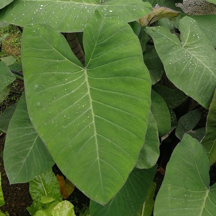 A tropical moisture-loving, tuberous, plant from Costa Rica with very large, wavy-edged, long-stalked, heart-shaped, dark green leaves.