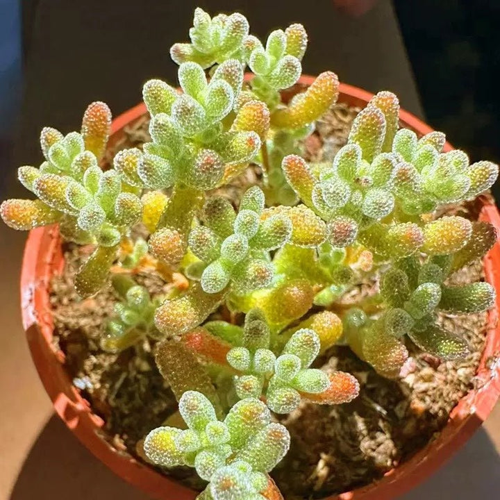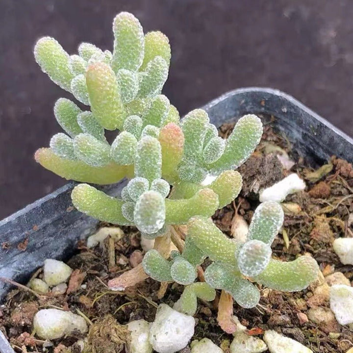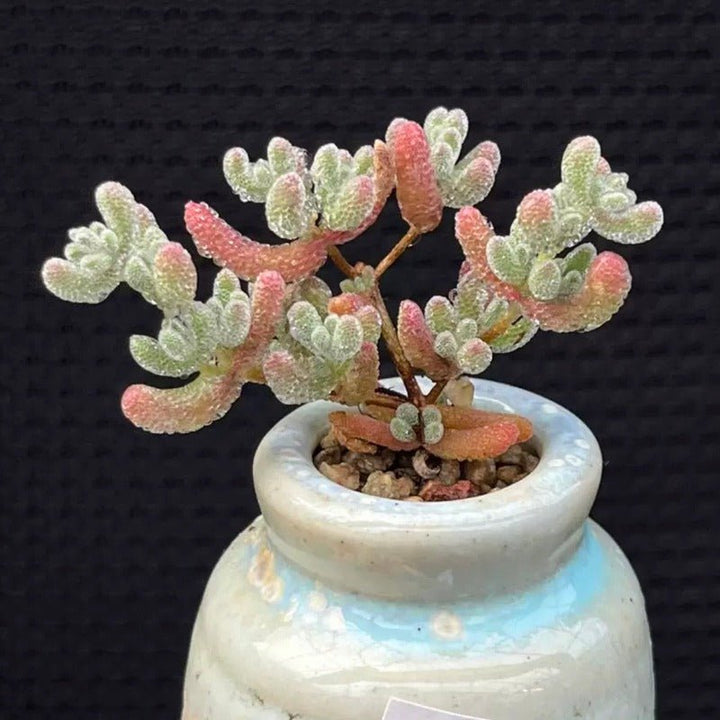 冰晶枝幹番杏是番杏科枝幹番杏屬的珍稀品種,以其晶瑩剔透的葉片表面著稱。葉片呈圓柱狀,密布透明水泡狀突起,在陽光照射下會產生如冰晶般的閃爍效果。植株會隨著生長逐漸形成匍匐蔓延的姿態,特別適合用於吊盆栽培或岩石園造景。