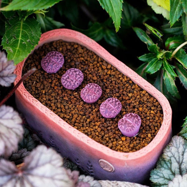 酒紅紫勳生石花是番杏科生石花屬的珍稀品種,以其深酒紅色的葉頂著稱。植株由一對肥厚葉片組成,頂面帶有獨特的斑紋,在適宜環境下會呈現紅褐色至紫紅色的飽和色澤。這種擬態石頭的形態特別適合用於岩石造景或迷你盆栽,展現大自然的奇妙設計。