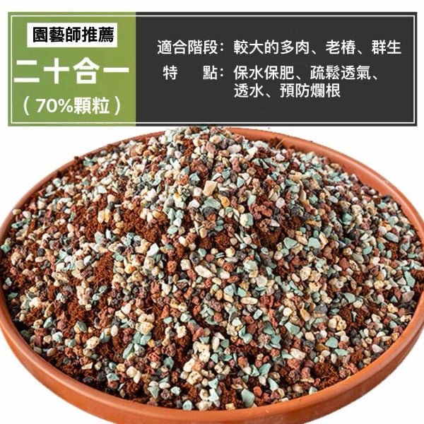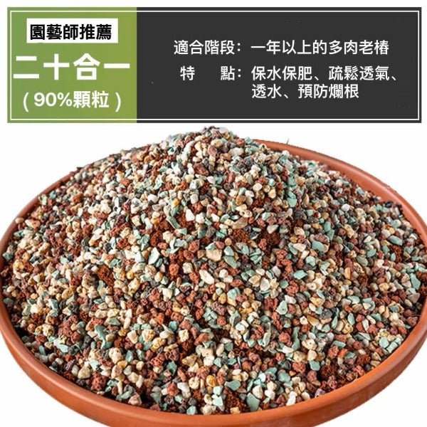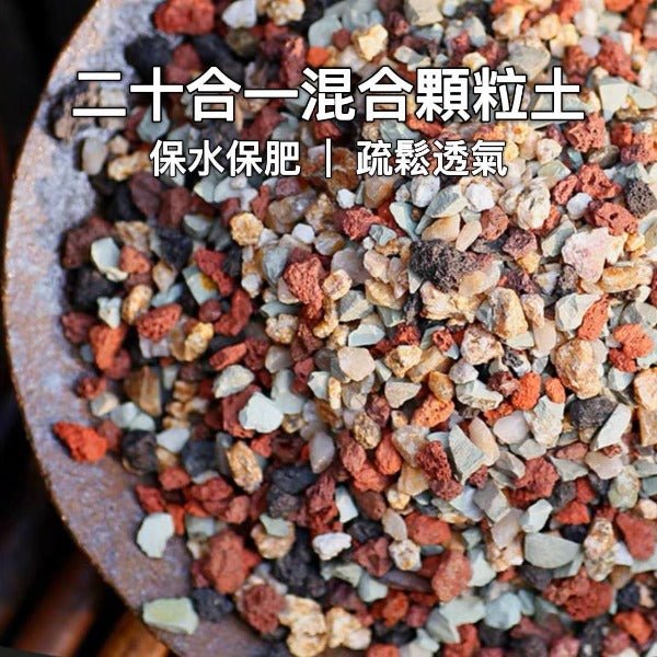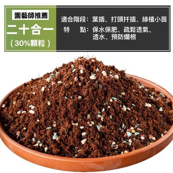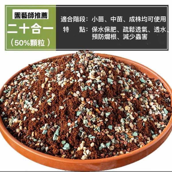 這款顆粒土用20種介質根據園藝師多年的種植經驗根據不同時期的植物用不同比例的配方混合而成。保水保肥、疏鬆透氣。非常有效地減低了積水導致爛根以及土壤蟲害的發生。
