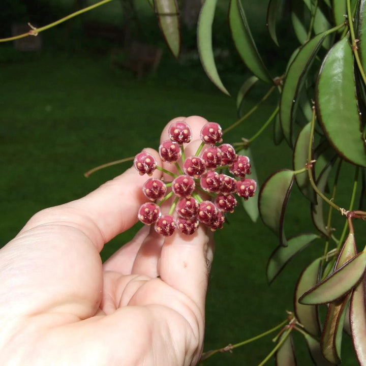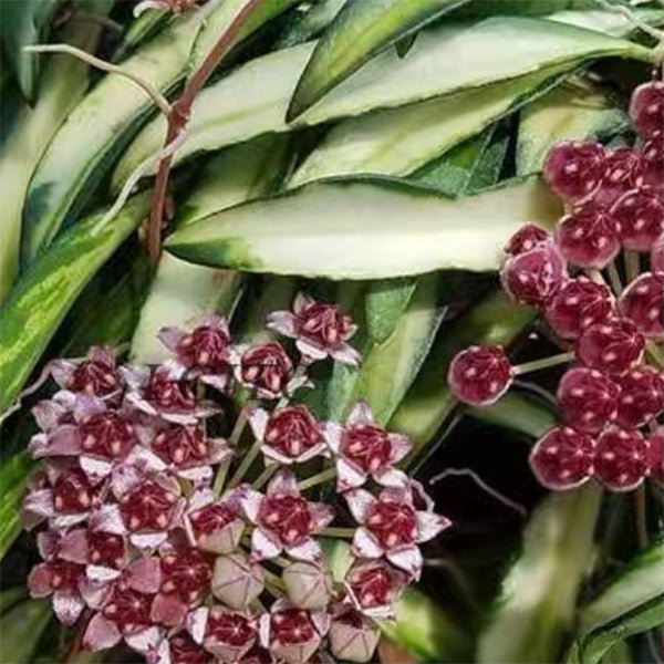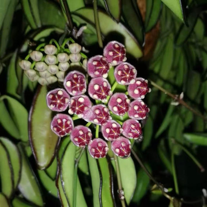 Hoya wayetii is a viningepiphytic plant in the dogbane family Apocynaceae.It is orignated from the Phillippines.The inflorescence is made up of multiple flowers in a group of umbel. The inflorences are purple, star-shpaed with yellow centers. They like made up of wax.The flower's surface fuzzy beacuse it is covered by tiny hair. They are heavily scented with a sweet fragrance.It has thich narrow leaves with dark-red edges.