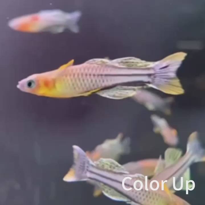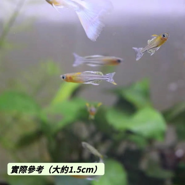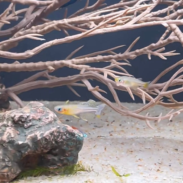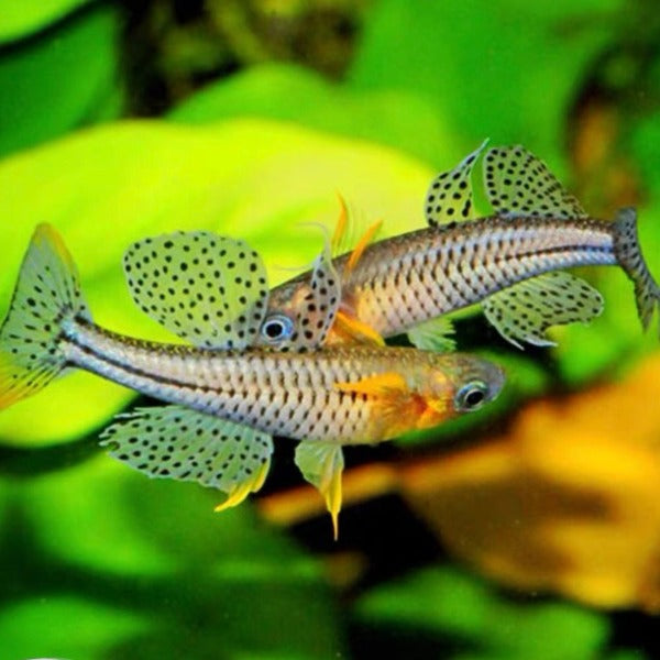 阿魯珍珠燕子是一種格外纖細嬌小的藍眼類,如同珍珠般灑落在魚鰭上的黑色圓點,是它們被稱為“珍珠”燕子的由來。在外觀特徵上,雄魚的前背鰭較為狹窄且鰭條末端拉尖;後背鰭則寬大圓潤如風帆一般,而臀鰭和後背鰭同樣具有類似的形狀,最後於胸鰭末端的一抹鮮黃,更是替它們增添了些許靈氣!相反的雌魚就完全不如雄魚那般具有寬大飄逸的羽鰭,性別十分容易辨認。