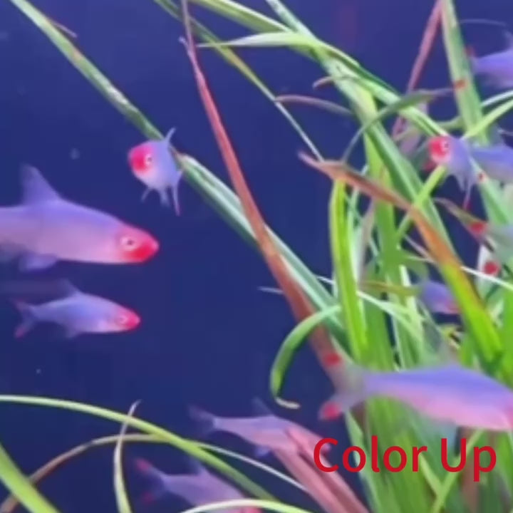 亞洲紅鼻燈魚體色透明中泛黃綠色,頭部和尾鰭尖部呈鮮豔的紅色。