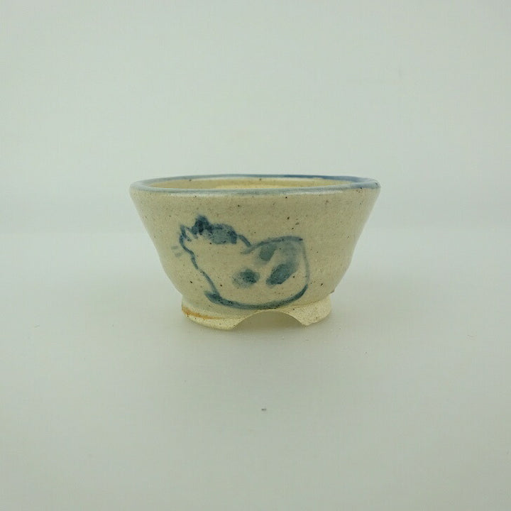 中古盆栽鉢 ゆうき祥石 小鉢 長辺 約 4.8cm 丸鉢 落款なし 絵鉢 猫 ネコ ねこ 釉薬 観賞用 中古 o1198426023