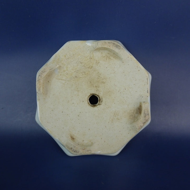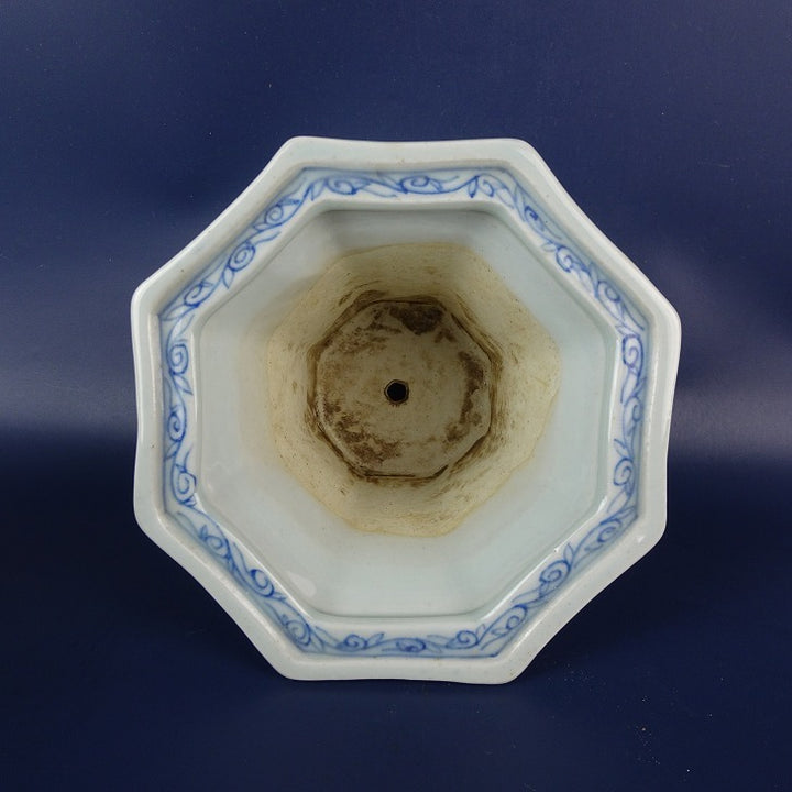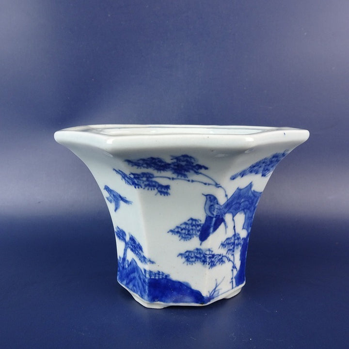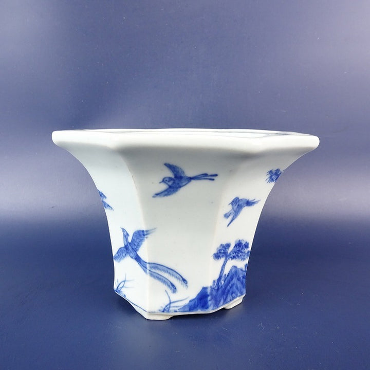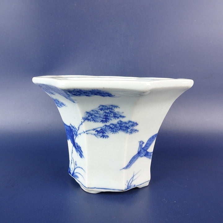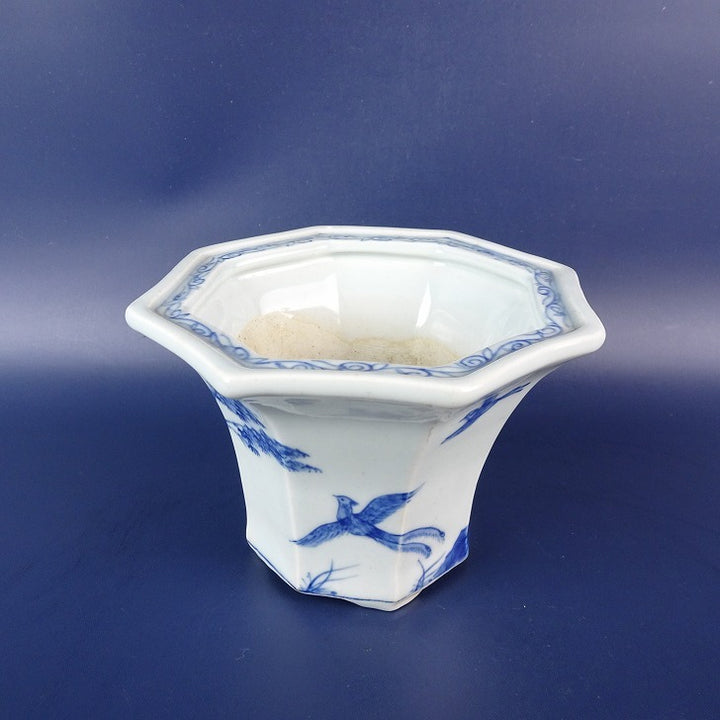 中古盆栽鉢 南京 落款なし 小型 長辺 約11.5cm 八角鉢 染付 鳥 木 観賞用 中古鉢 k1198410823