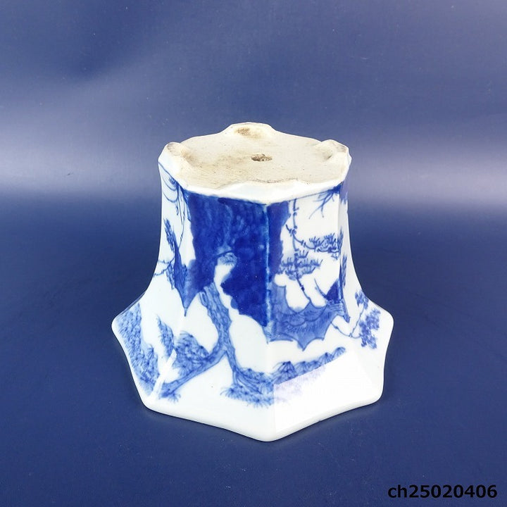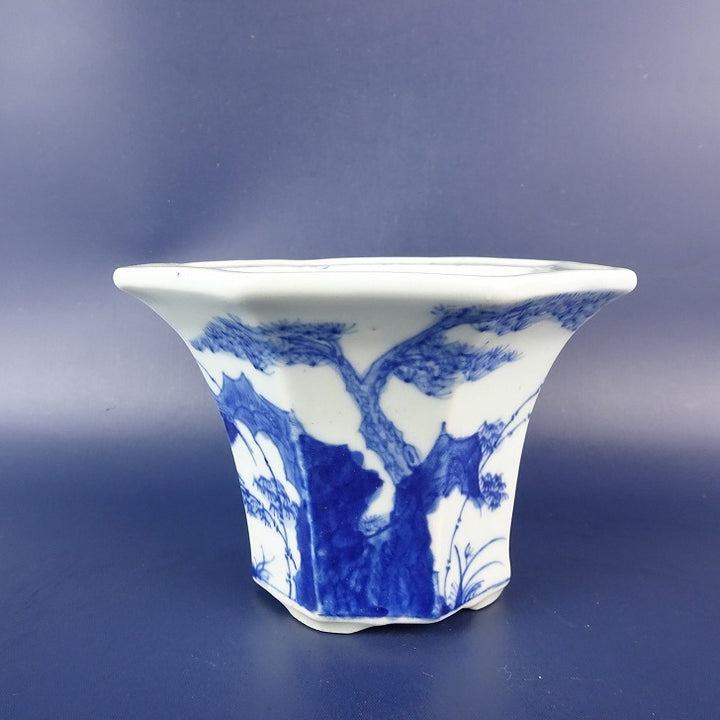 【中古】盆栽鉢 南京 落款なし 小型 長辺 約11.5cm 八角鉢 染付 鳥 木 現品 中古鉢 品名南京 落款なし...
