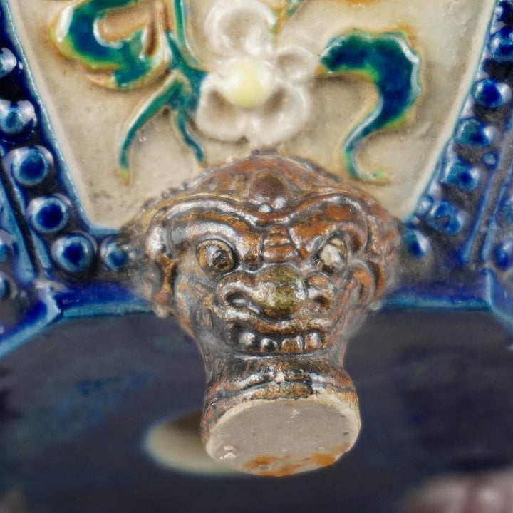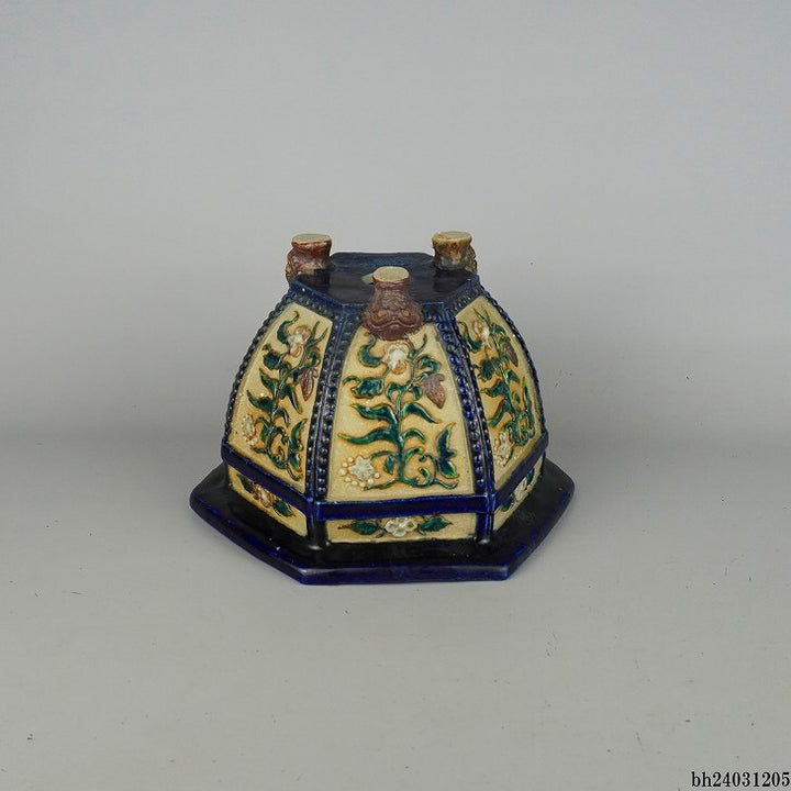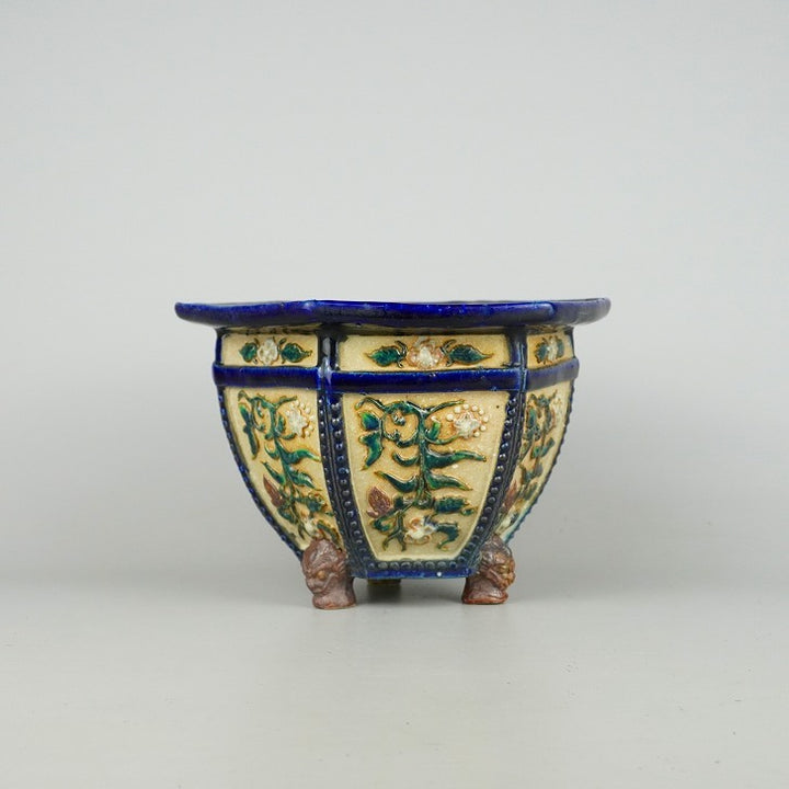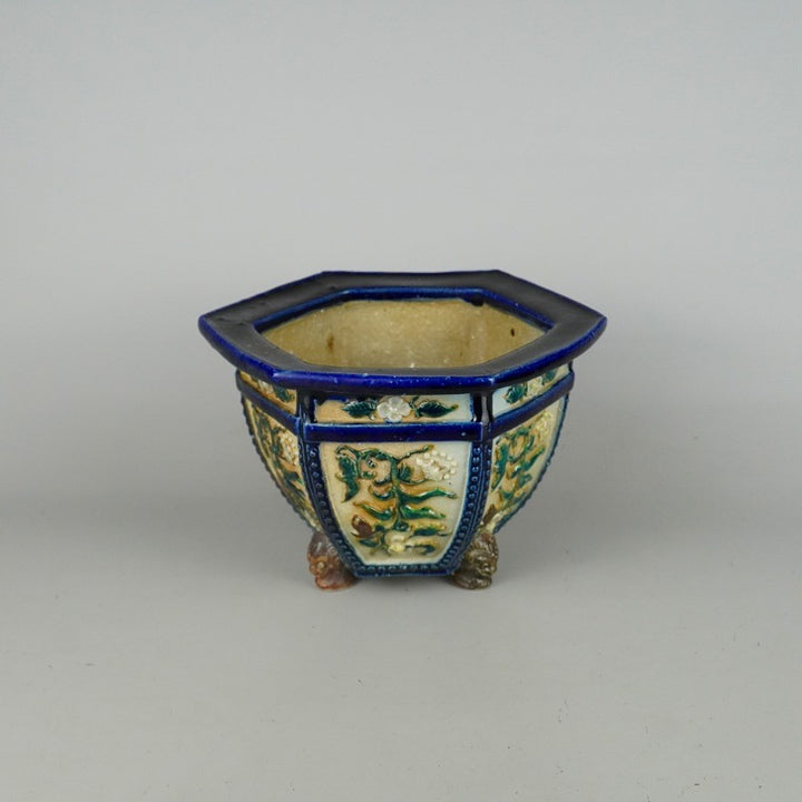 中古盆栽鉢 司峰 中型 長辺 約21cm 六角鉢 外縁 鬼面足 浮彫 色絵 華 花 観賞用 中古鉢 h1198427664