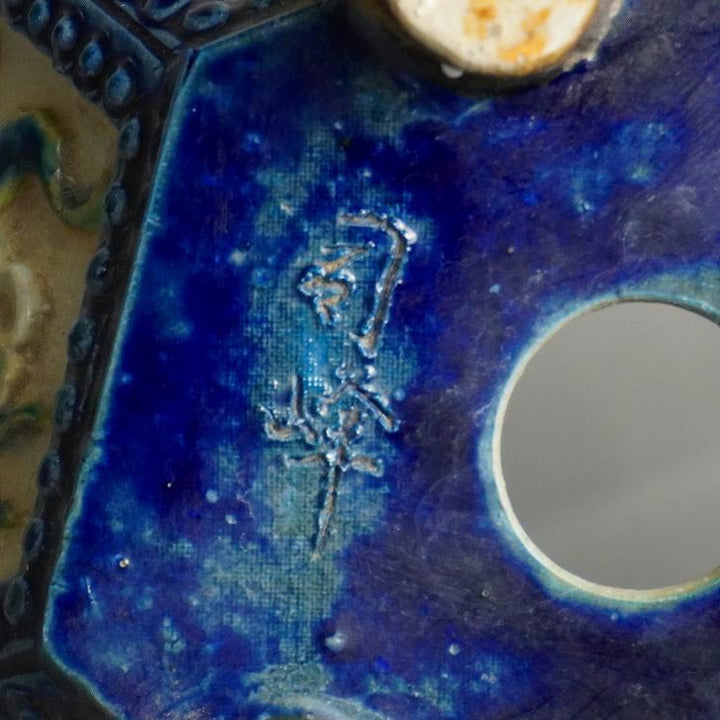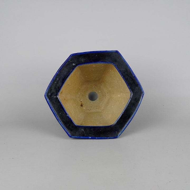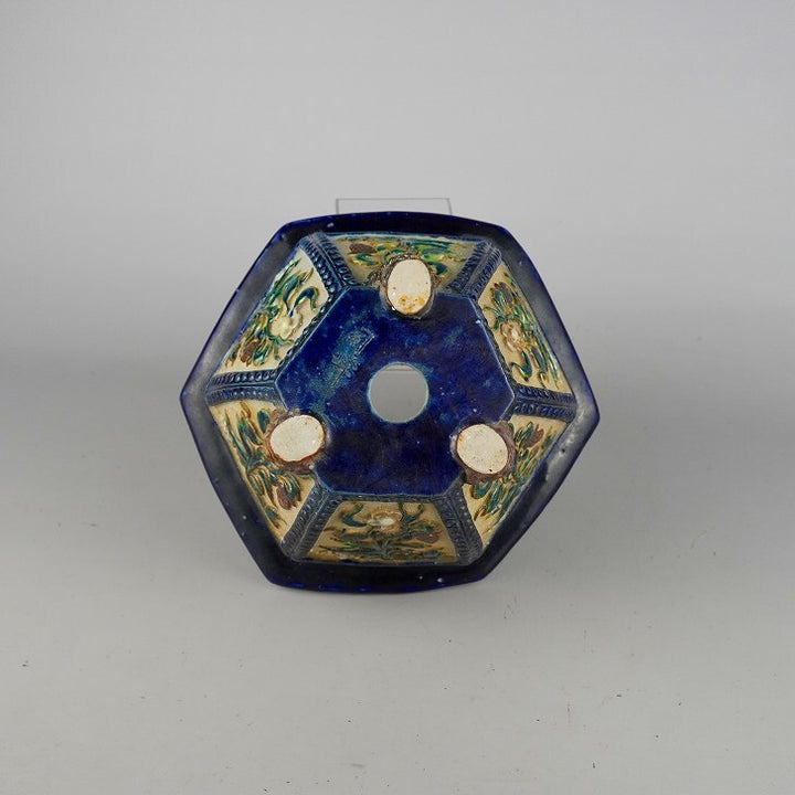 盆栽鉢 司峰 中型 長辺 約21cm 六角鉢 外縁 鬼面足 浮彫 色絵 華 花 観賞用 現品 中古鉢 品名司峰...
