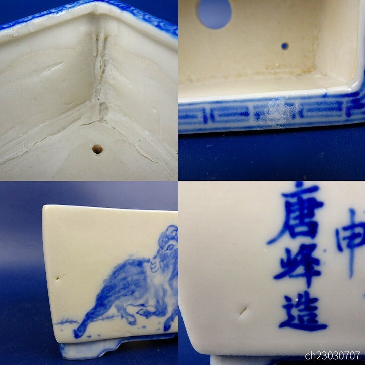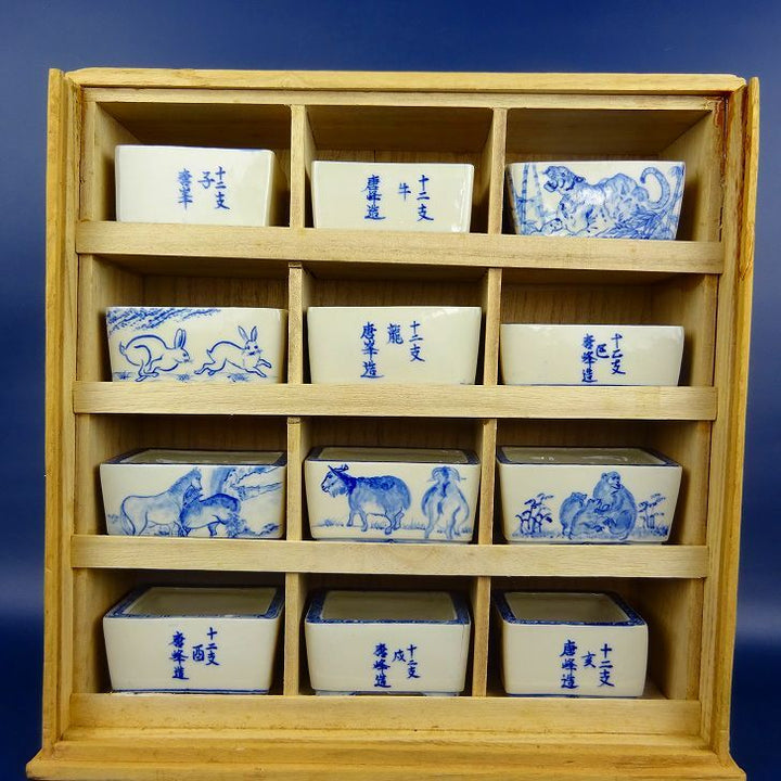 中古盆栽鉢 唐峰造 小鉢 長辺 約9cm 長方鉢 染付 十二支 干支 子 丑 寅 卯 辰 巳 午 未 申 酉 戌 亥 12鉢セット 中古鉢 v1198434888