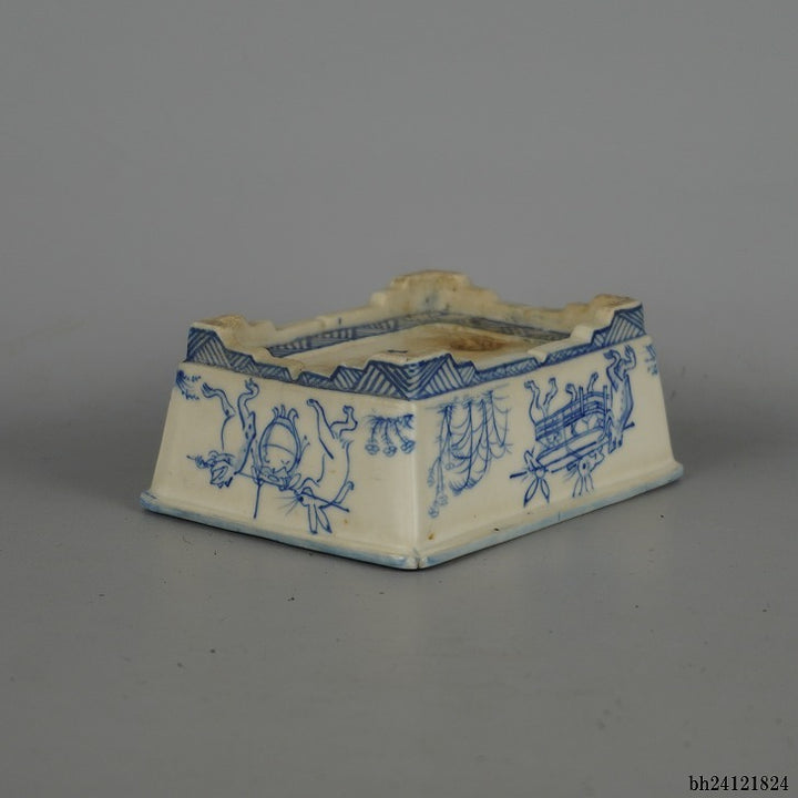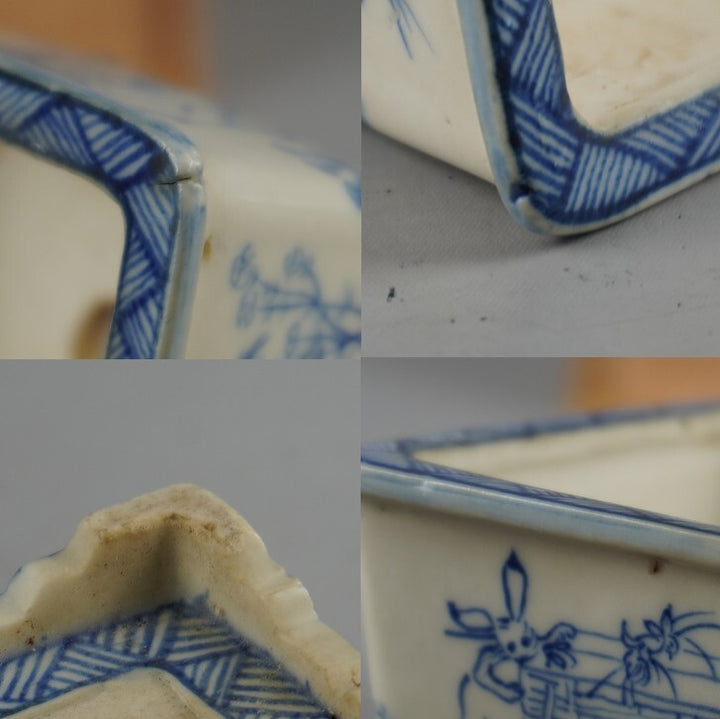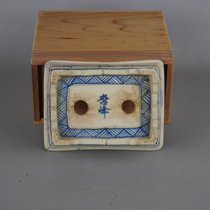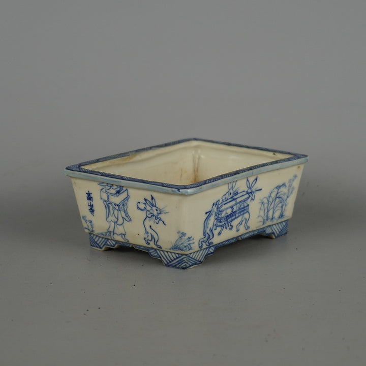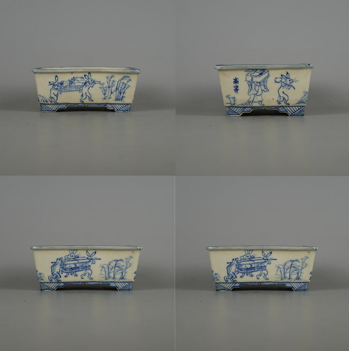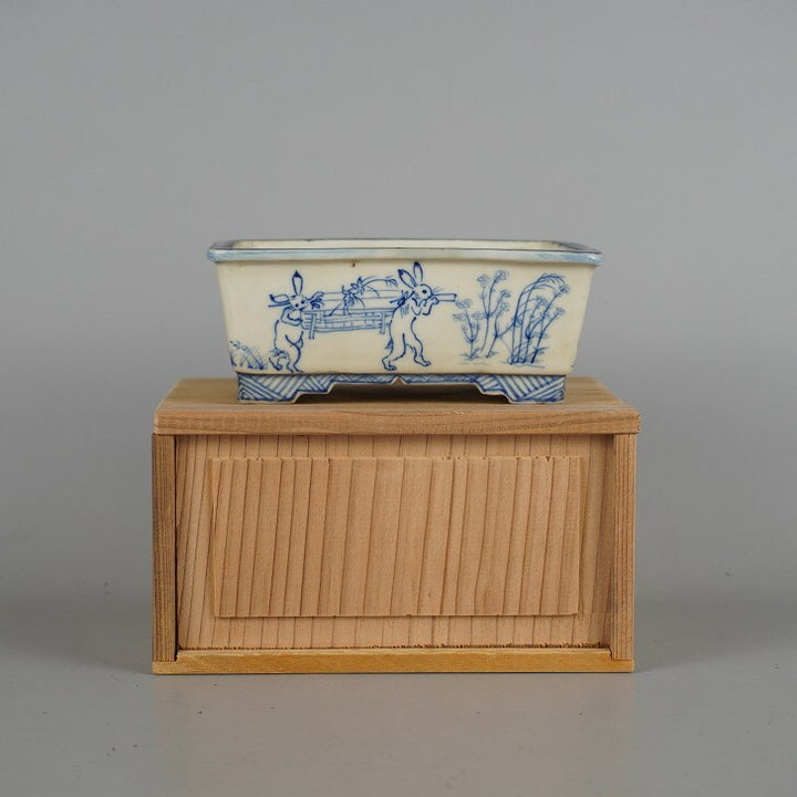 盆栽鉢 唐峰 小型 長辺 約12.5cm 長方鉢 縁付 染付 高山寺 ウサギ カエル 箱付 観賞用 現品 中古鉢 品名唐峰(箱付)...