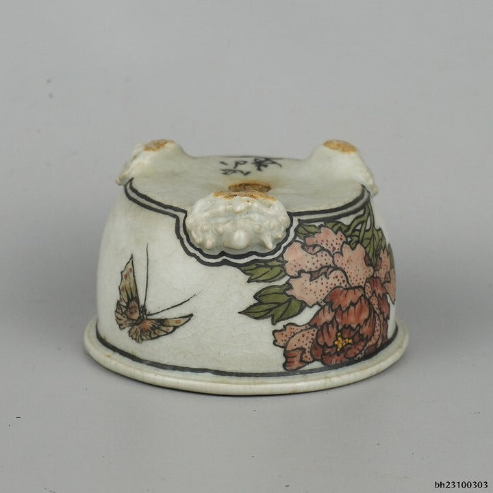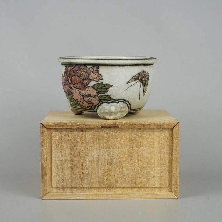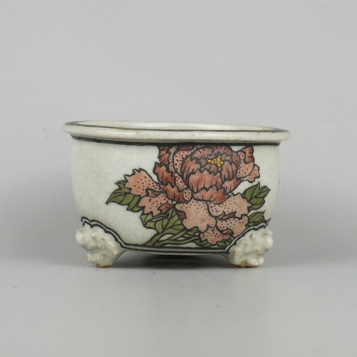 中古盆栽鉢 大助 心山造 小鉢 長辺 約9cm 丸鉢 色絵 牡丹 蝶 ボタン 花 チョウ 箱付 観賞用 中古鉢 q1198408297