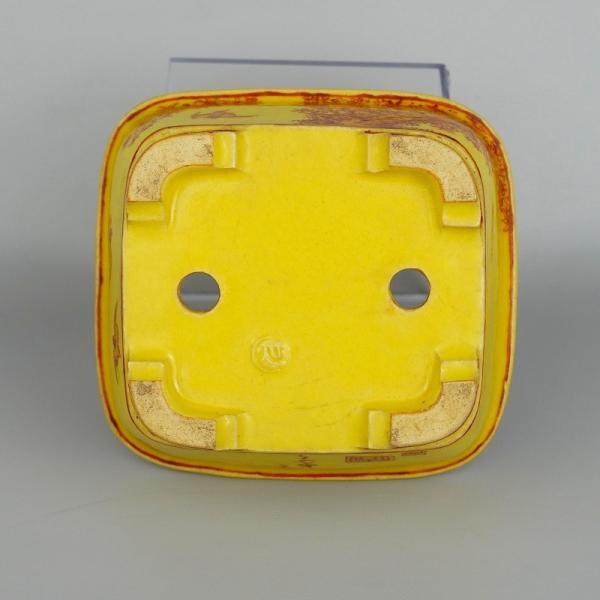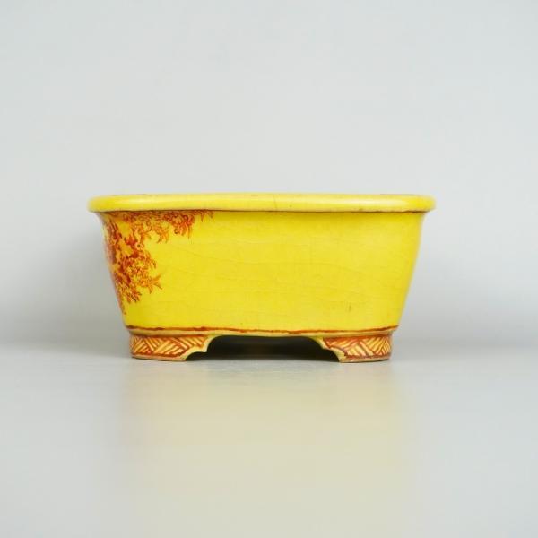 中古盆栽鉢 大助 心山 小型 長辺 約11cm 長方鉢 外縁 赤絵 鳥 山水図 はくら ぶんちょう 黄釉 釉物 観賞用 中古鉢 m1198405148
