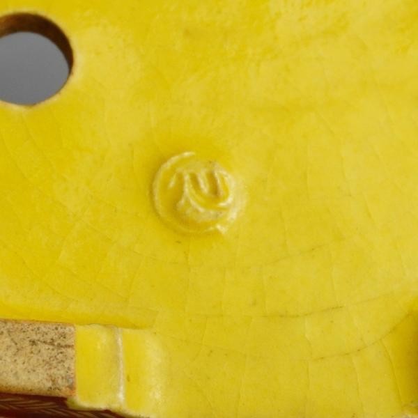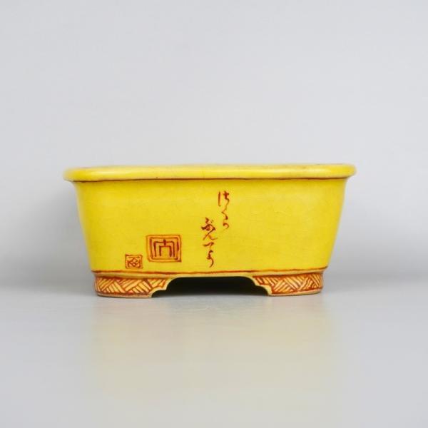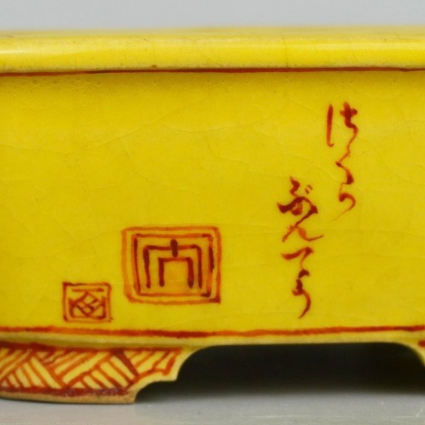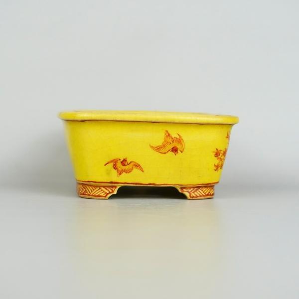 盆栽鉢 大助 心山 小型 長辺 約11cm 長方鉢 外縁 赤絵 はくら ぶんちょう図 鳥 黄釉 釉物 観賞用 現品 中古 品 名大助 心山 サイズ高さ 約4.5センチ...