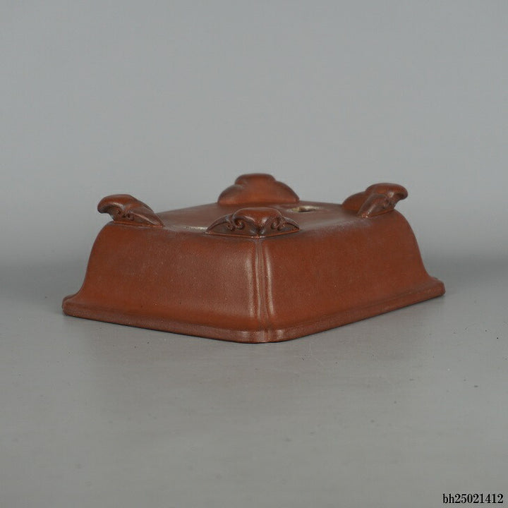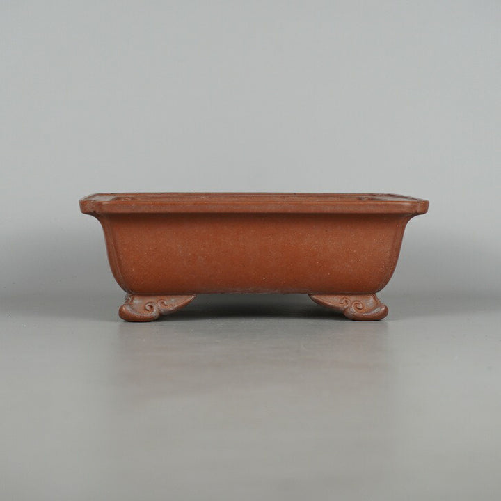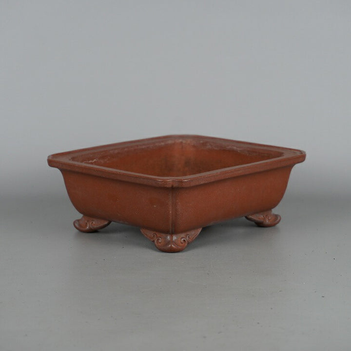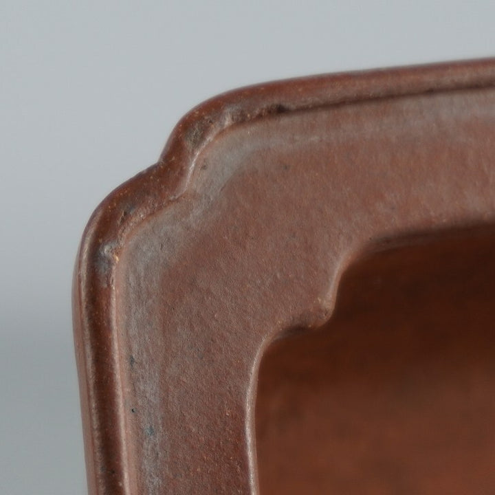盆栽鉢 常滑 壹興 中型 長辺 約 20cm 長方鉢 外縁 隅入 雲足 泥物 現品 中古鉢 本名:渡辺一弘 父、渡辺正山のもとで修業しながら釉薬を研究し、昭和53年頃から小品樹鉢焼成をはじめる。 タタラづくり主体の釉色樹鉢や釉色水盤、釉色は、織部、均釉、白交趾、黄交趾、瑠璃釉などが主でその中間色もあり多彩である。泥色、小品、大物の盆器を鉢・水盤ともつくる常滑の盆器作家。 作家名は「かずひろ」と読みますが、一般的に「いっこう」と訓読みされている。...