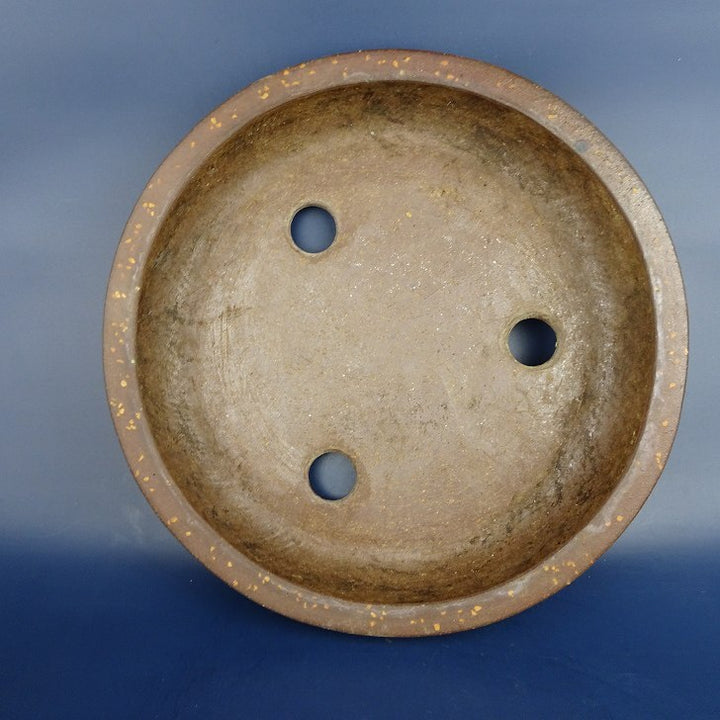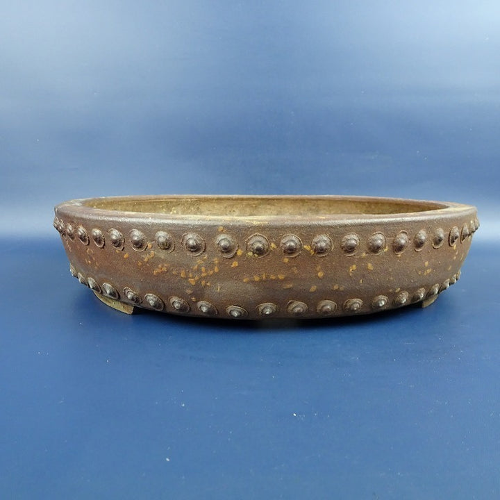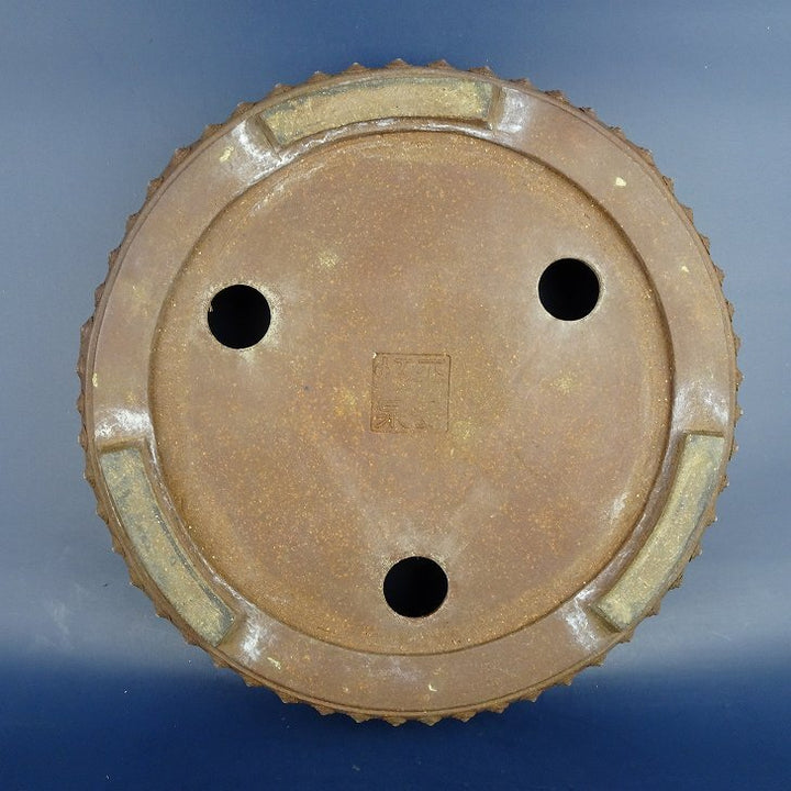 【中古】盆栽鉢 平安虹泉 中型 長辺 約26.3cm 丸鉢 鋲打 泥鉢 現品 中古鉢 平安虹泉 昭和8年2月28日生まれ。昭和30年ごろから盆栽を始める。 東福寺鉢に魅せられて昭和40年ごろから全くの独学で鉢づくりを開始。焼成を登り窯に固執し、次々と廃窯になっていく中で最終的に河合寛次郎氏の登り窯で焼かせてもらうことになる。東福寺の梨皮泥の再現に2年間取り組み、釉薬も均釉・織部・辰砂・蕎麦などは既製品の釉料にあきたらず、独自の工夫を試みる。...