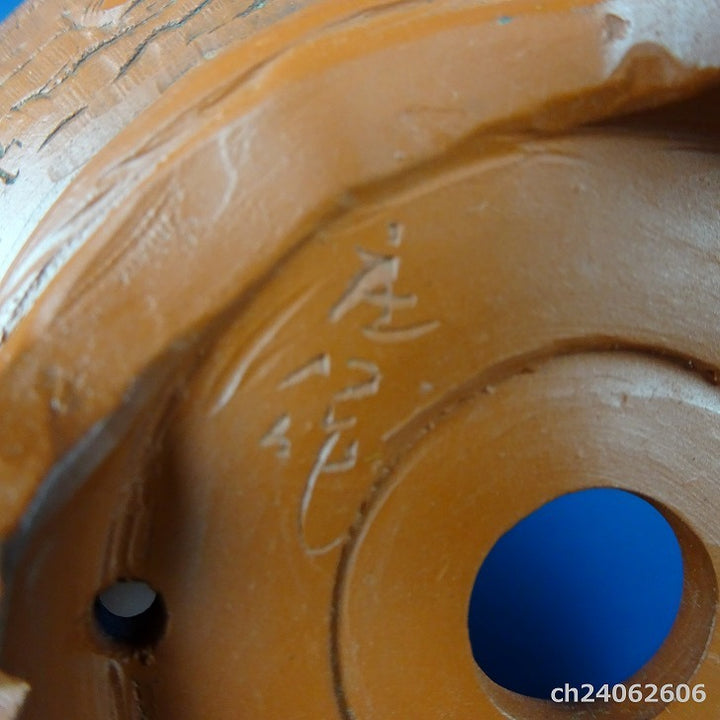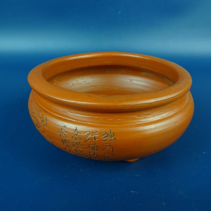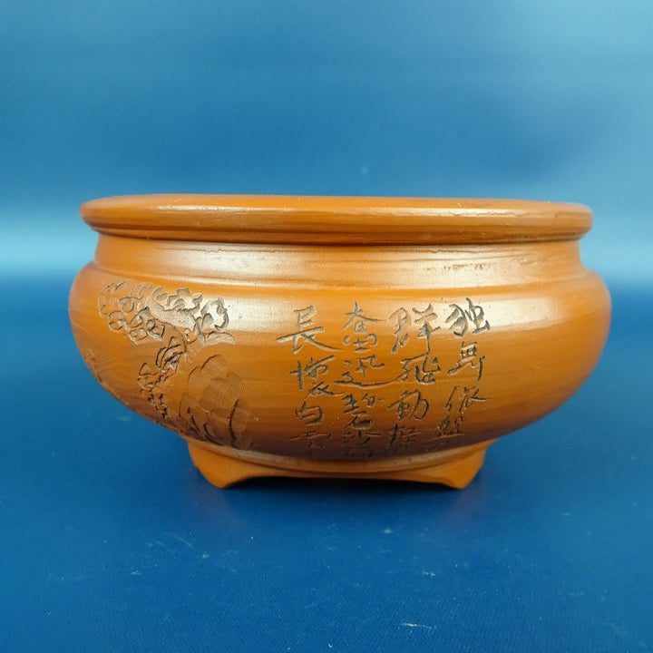 中古盆栽鉢 庄八 小鉢 長辺 約9.7cm 丸鉢 袋式 釘彫 人物 鳥 風景画 漢文 箱付 観賞用 中古鉢 n1198406145