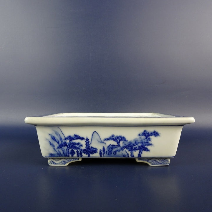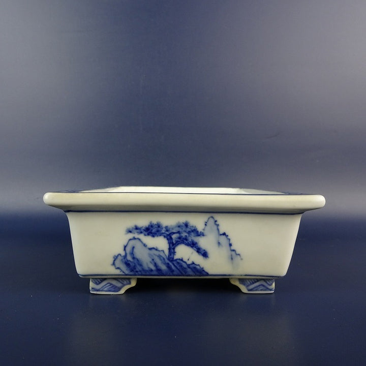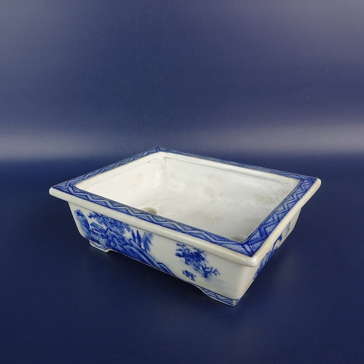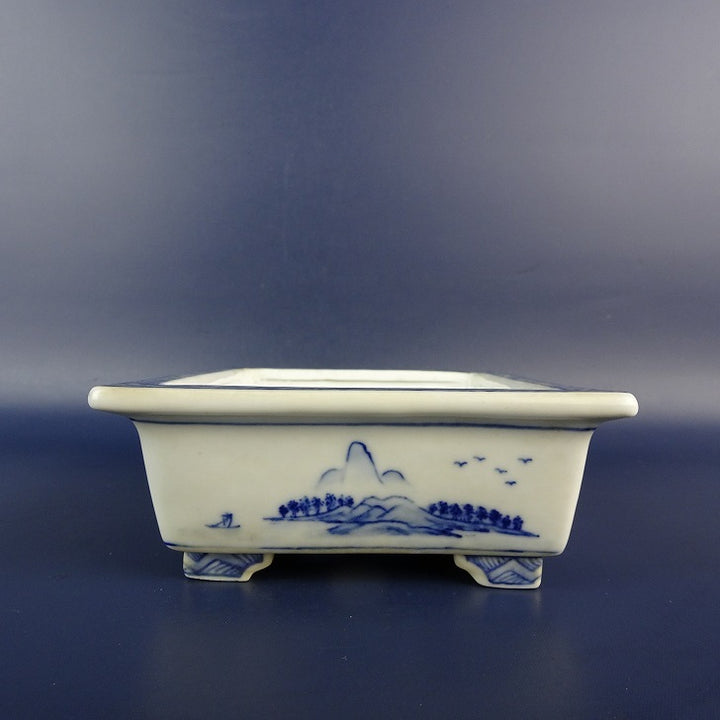 中古盆栽鉢 有度山 小型 長辺 約 13.5cm 長方鉢 外縁 染付 風景 中国鉢 中古鉢 b1198423111
