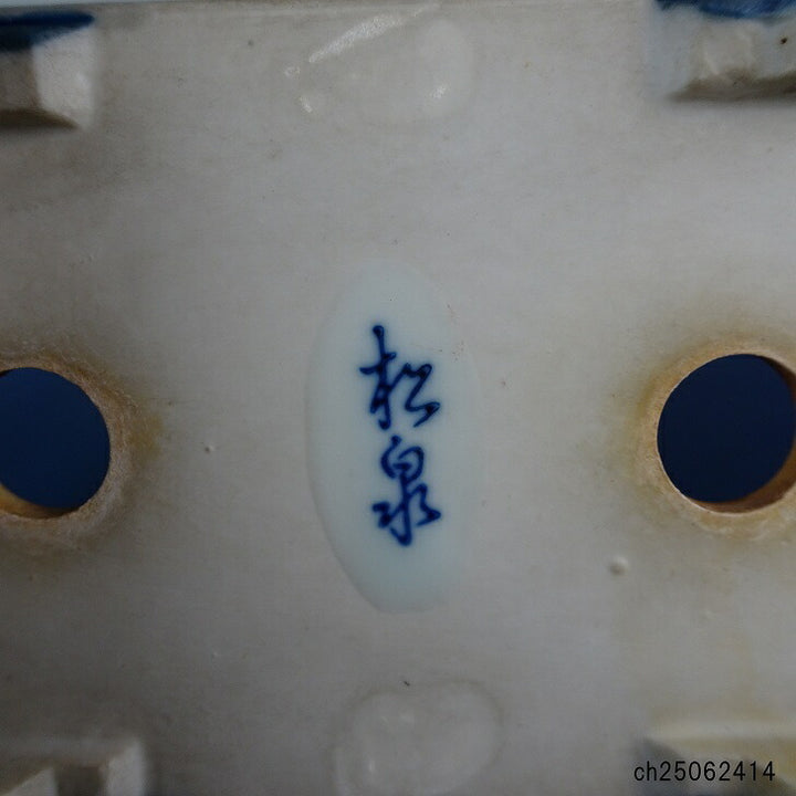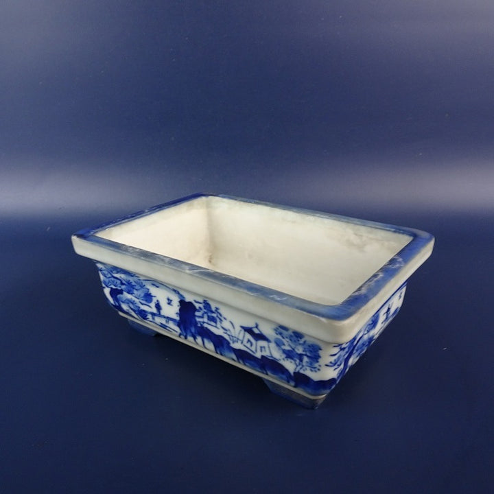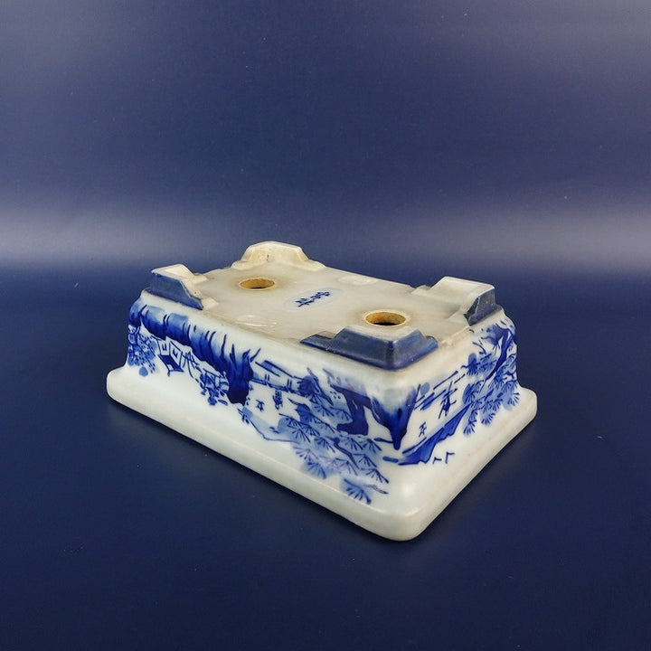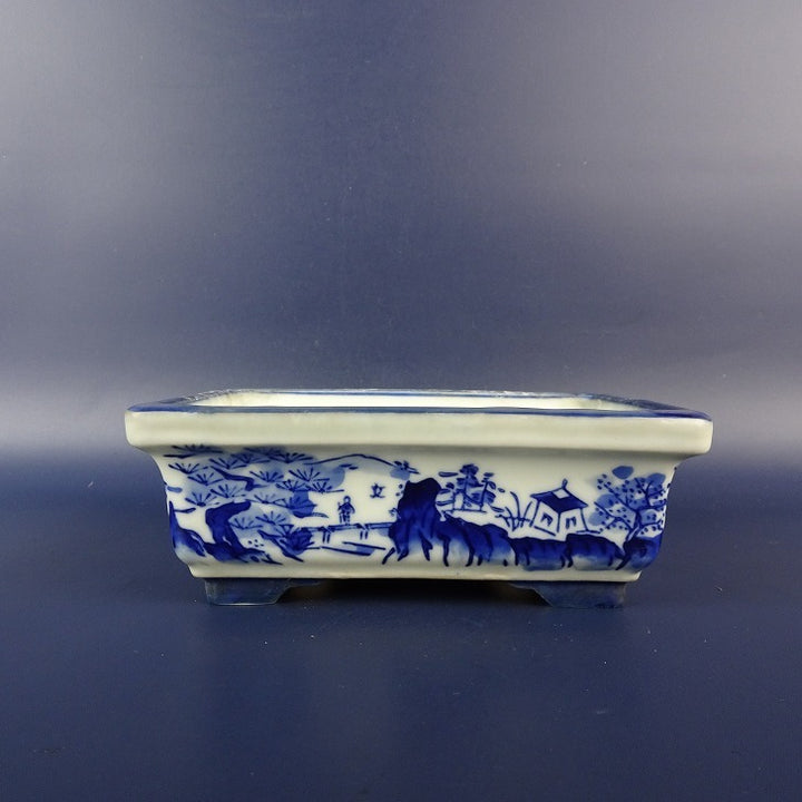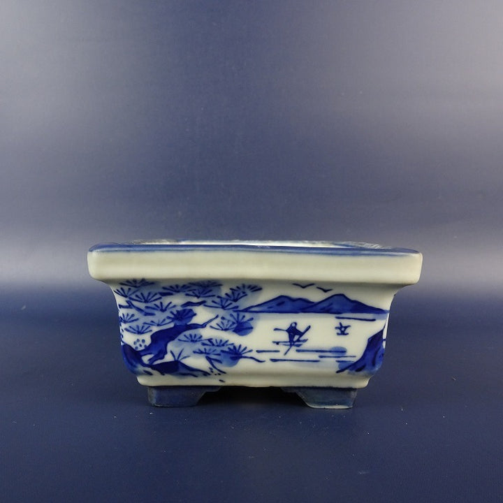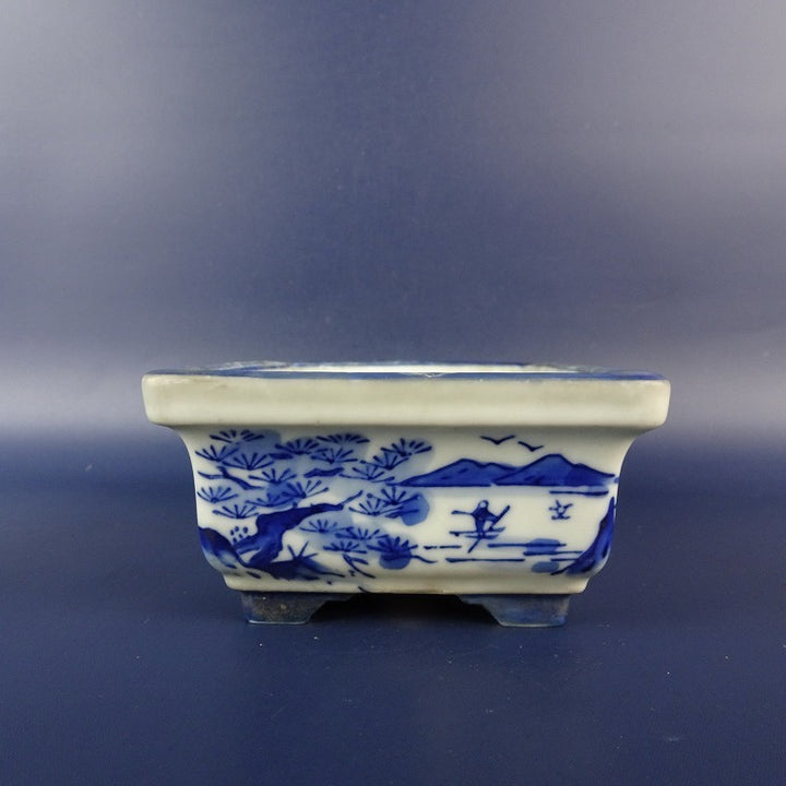 中古盆栽鉢 松泉 小型 長辺 約 13.3cm 長方鉢 外縁 染付 風景画 人物 中国鉢 観賞用 中古鉢 v1198439725