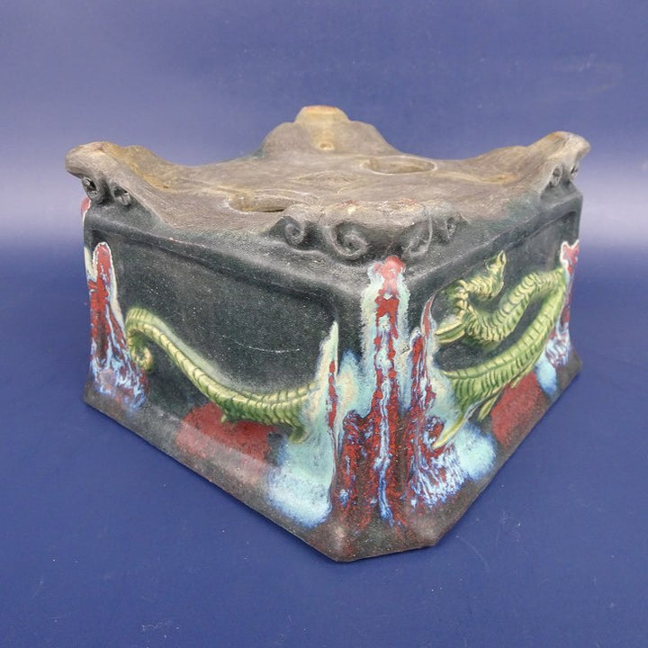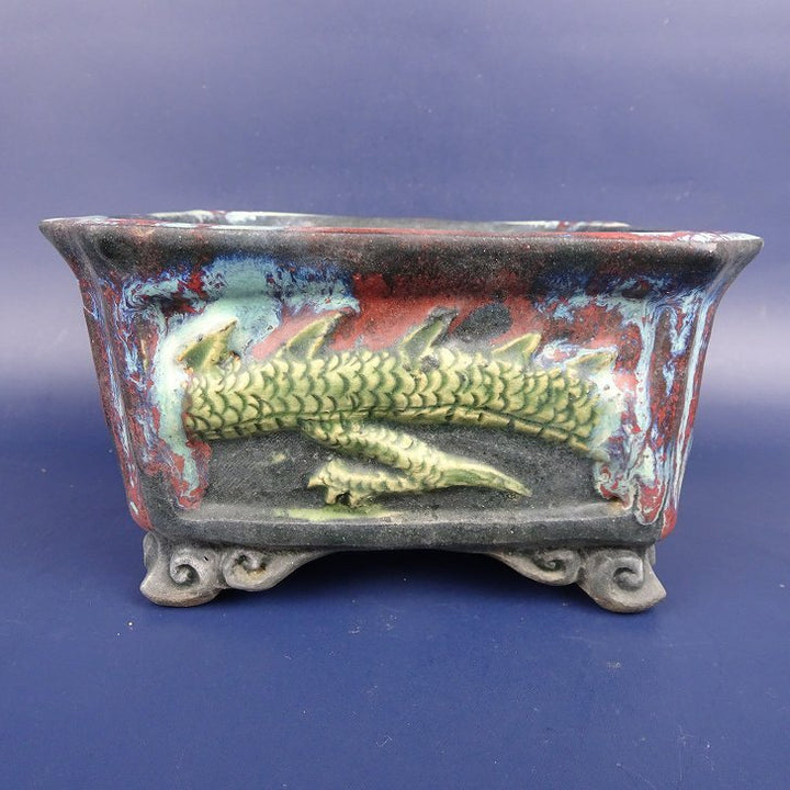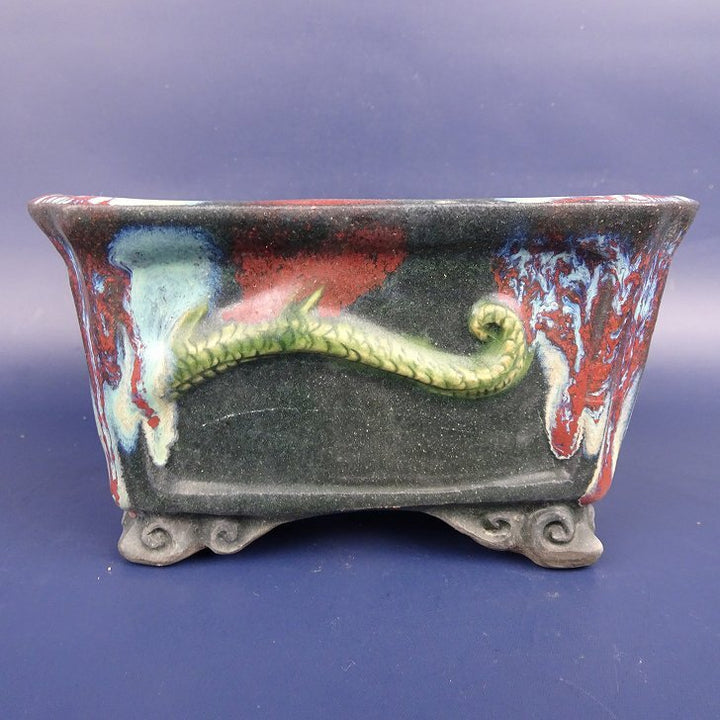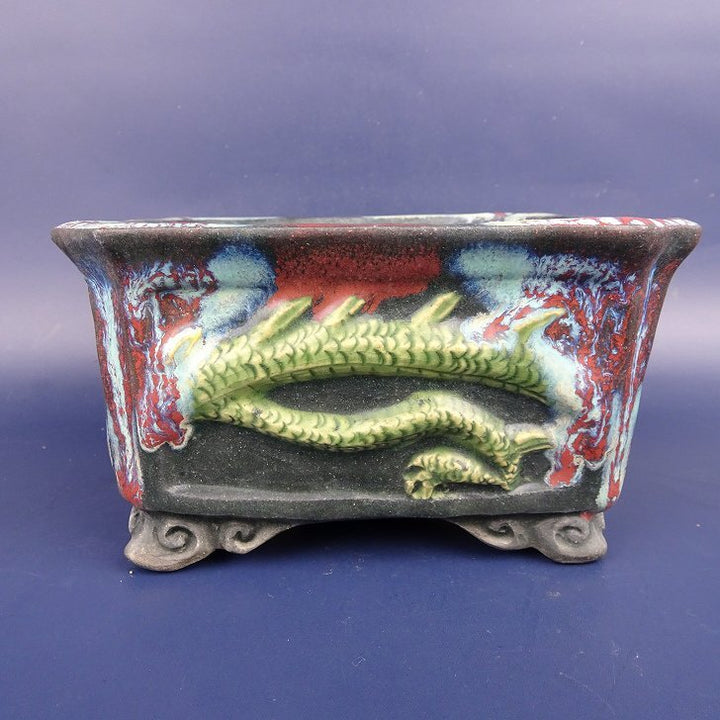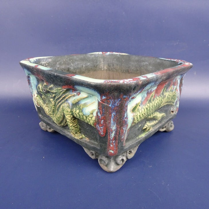 中古盆栽鉢 正志 古本 正志 小型 長辺 約13.5cm 正方鉢 龍 竜 浮彫 雲足 中古鉢 w1198414261
