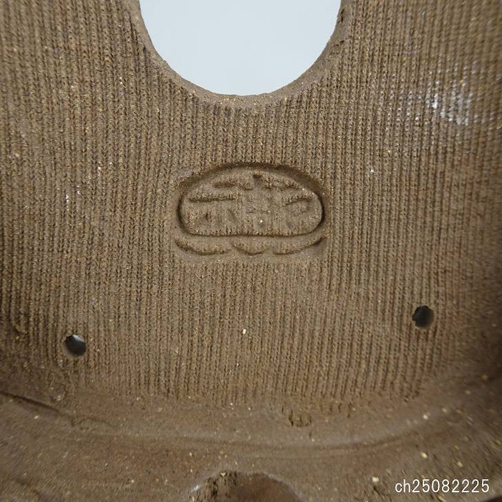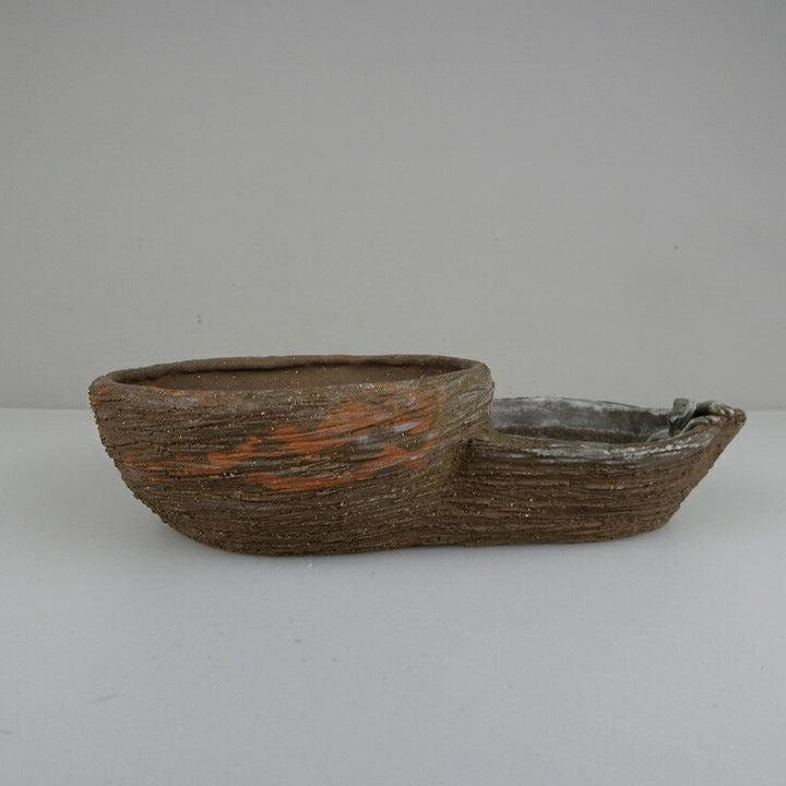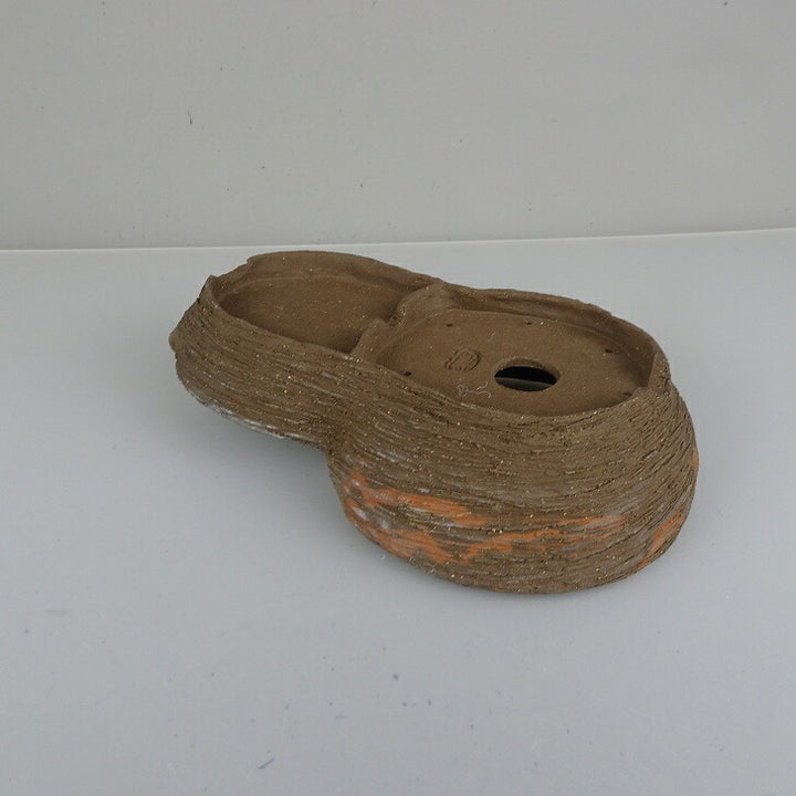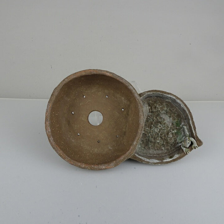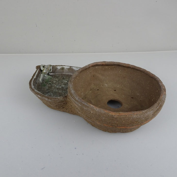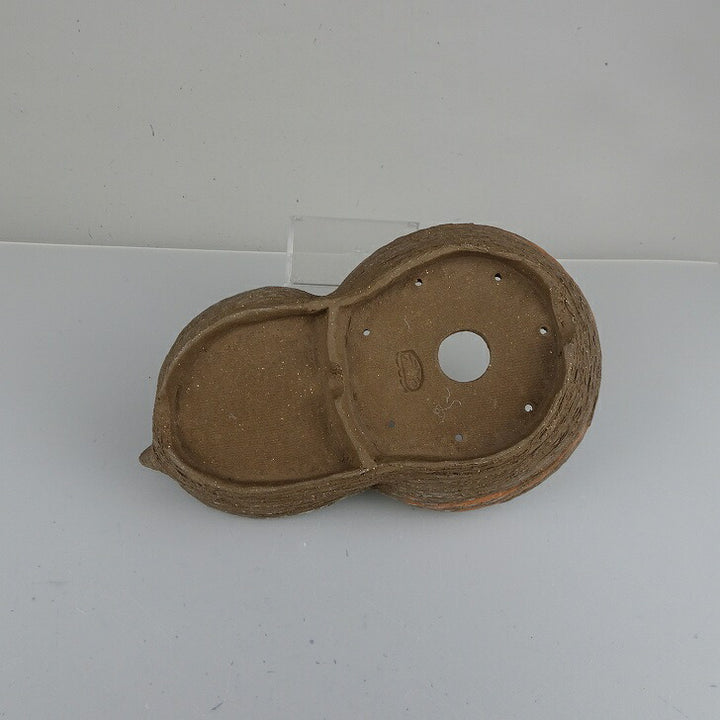 中古盆栽鉢 神戸 小型 長辺 約17.6cm 変形 丸鉢 ヒョウタン型 蛙付 かえる カエル 泥物 中古鉢 q1207283877
