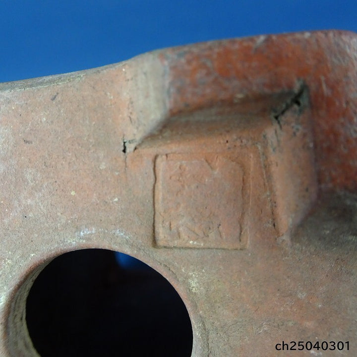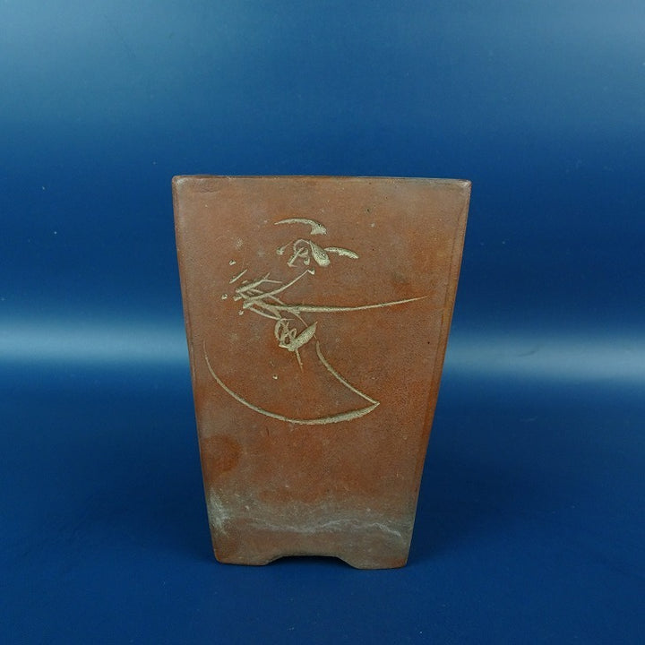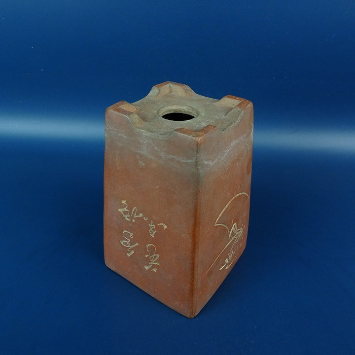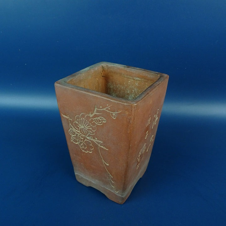【中古】盆栽鉢 落款あり 小型 高さ 約 12.2cm 正方鉢 釘彫 花 文字 泥鉢 観賞用 現品 中古鉢 品名落款あり...